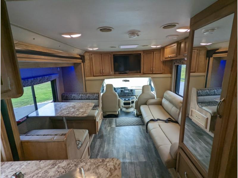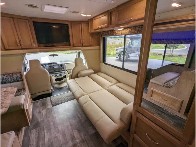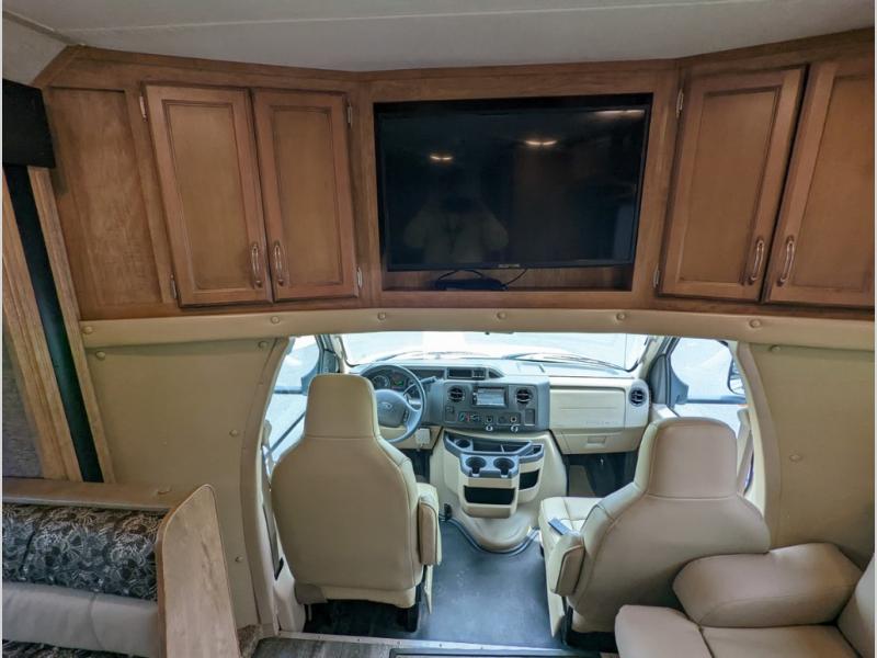 A TV mount can be found up above the cab area along with storage cabinets on each side, plus so much more!
