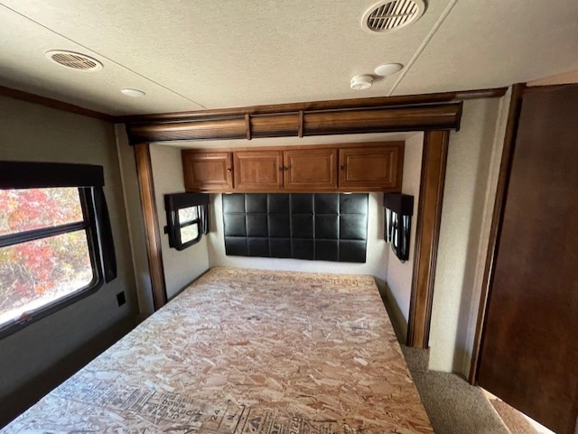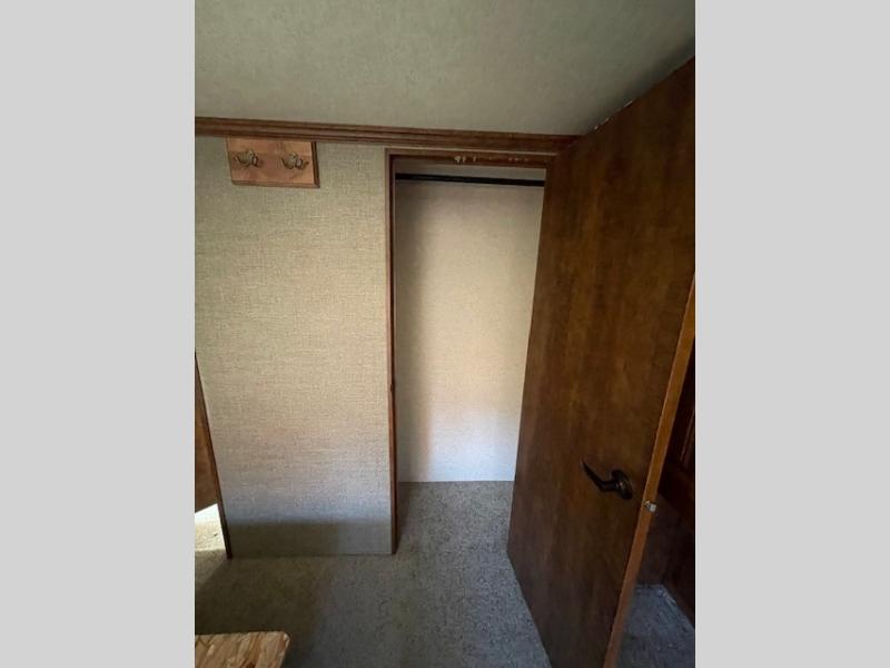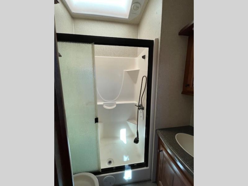 Head to the rear and find a side aisle bath with shower, toilet and sink. Just outside the bathroom door head up two more steps to a raised platform bedroom featuring a king bed slide and wardrobe slide out opposite.
