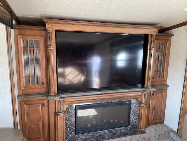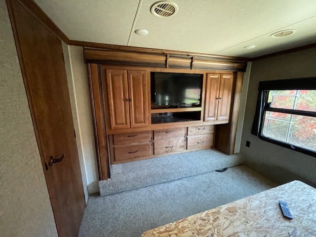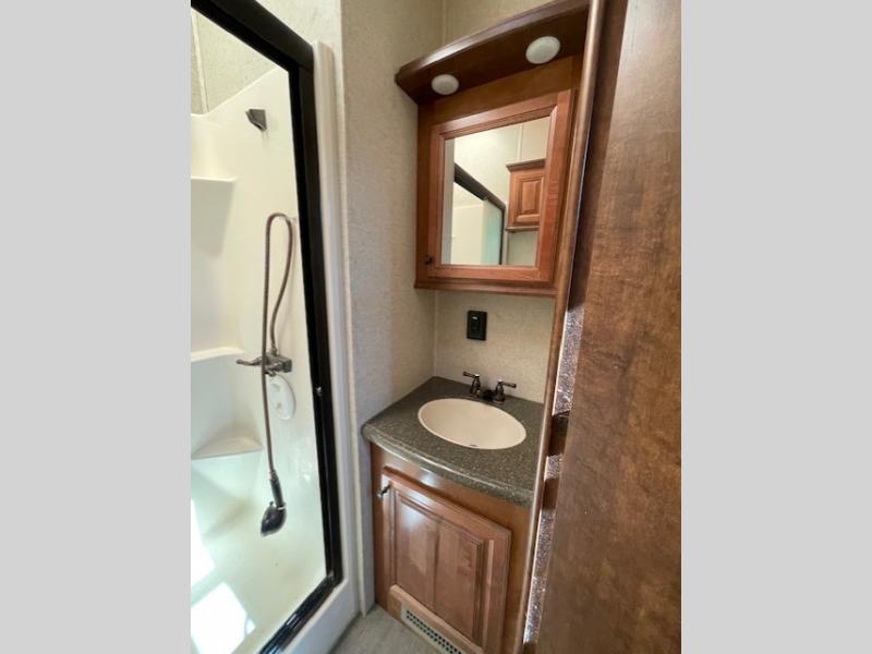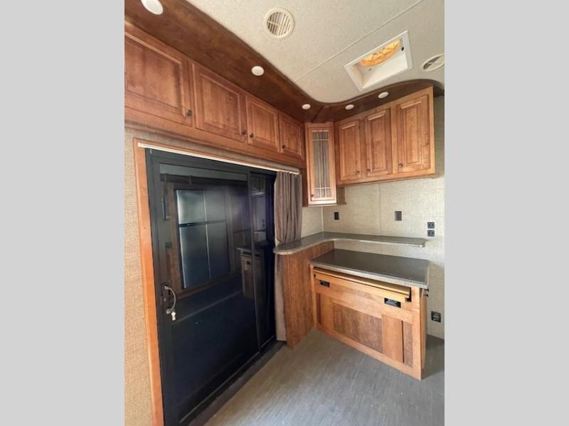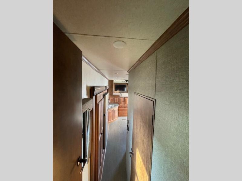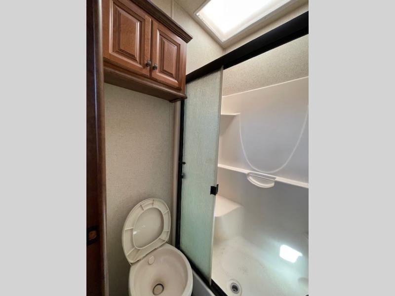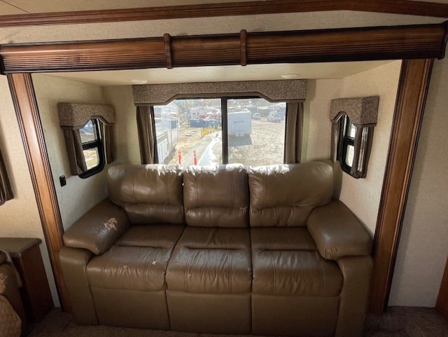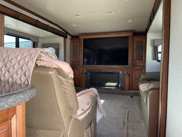 Step inside and head up to the raised living room which features dual opposing slides both with a sofa to enjoy. These can easily become additional sleeping space if needed at night. There is also theater seating for two at the top of the steps to your left. A great space to entertain or enjoy conversations with family and friends. The entire front wall shows off a large flat screen TV and entertainment center with storage both above and below.