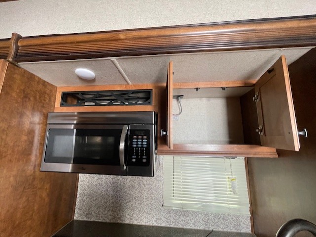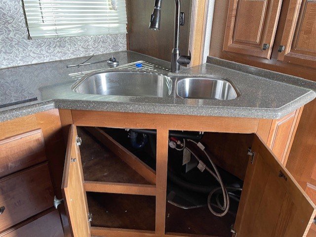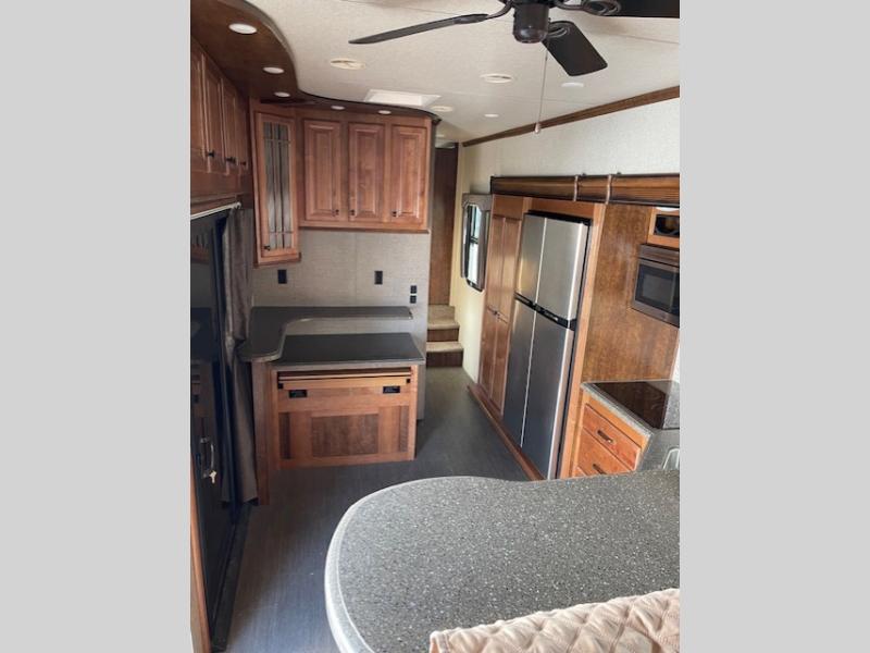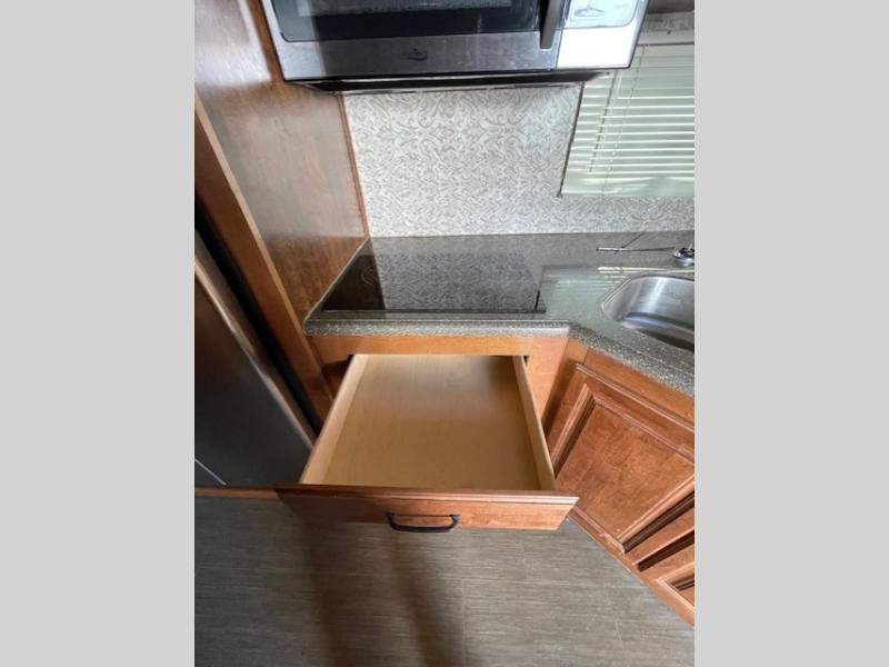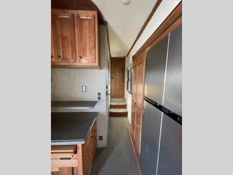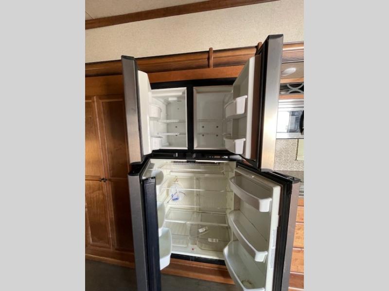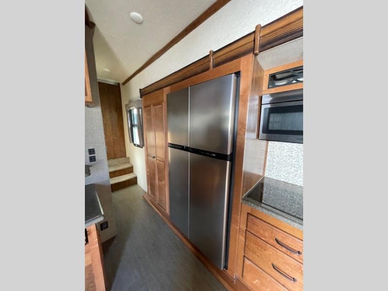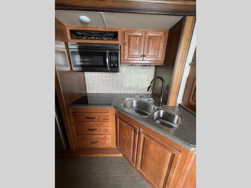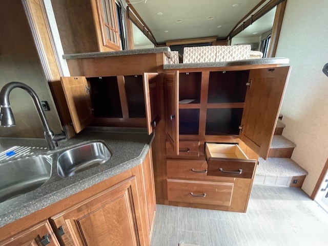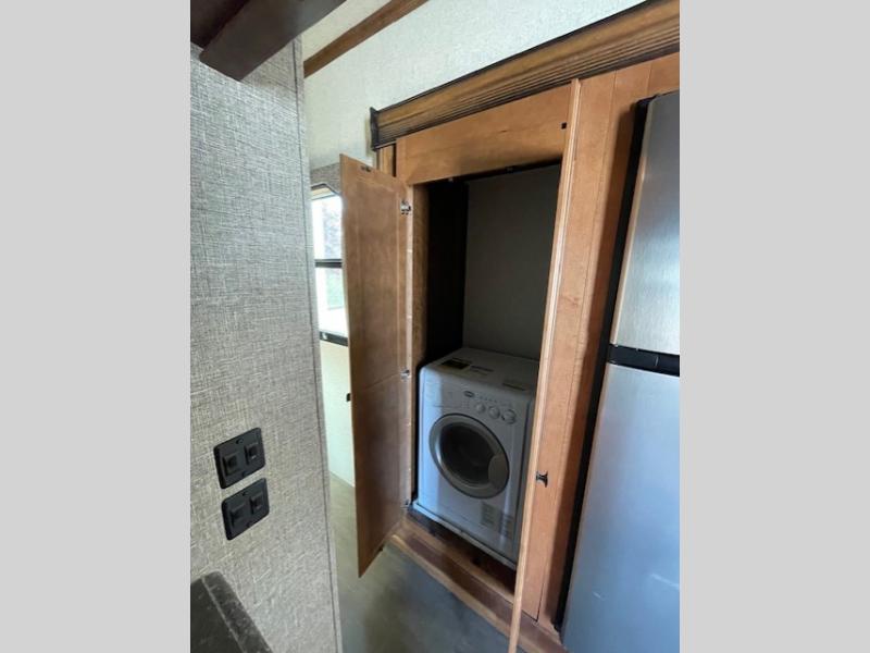 Back down to the main living space enjoy a kitchen almost like home. To your right is ample counter top space for prep work and serving, a pantry, plus all the standard amenities inside a road side slide out like a double door refrigerator, three burner range with overhead microwave, and a double kitchen sink for easy cleanup. There is even a space in the slide out that has been prepped for a washer and dryer for added convenience.