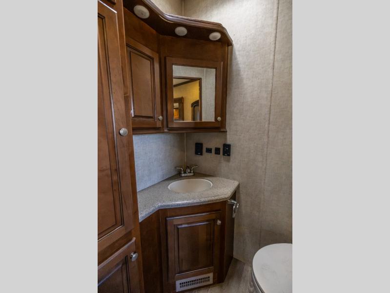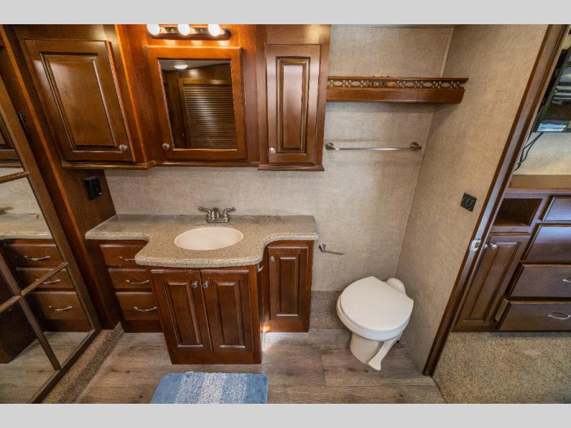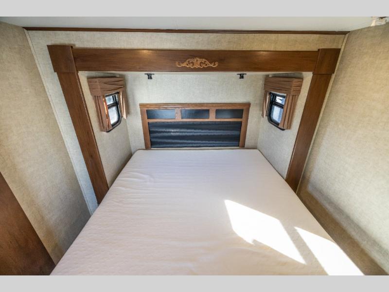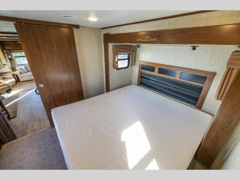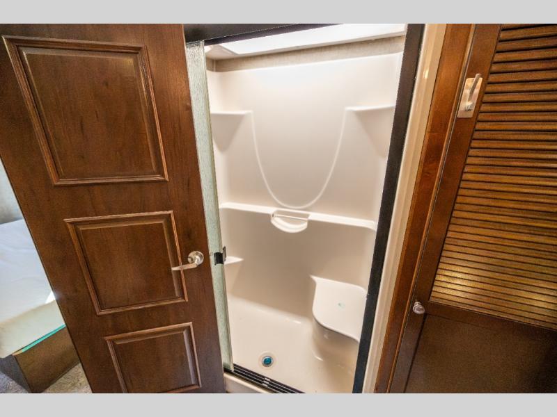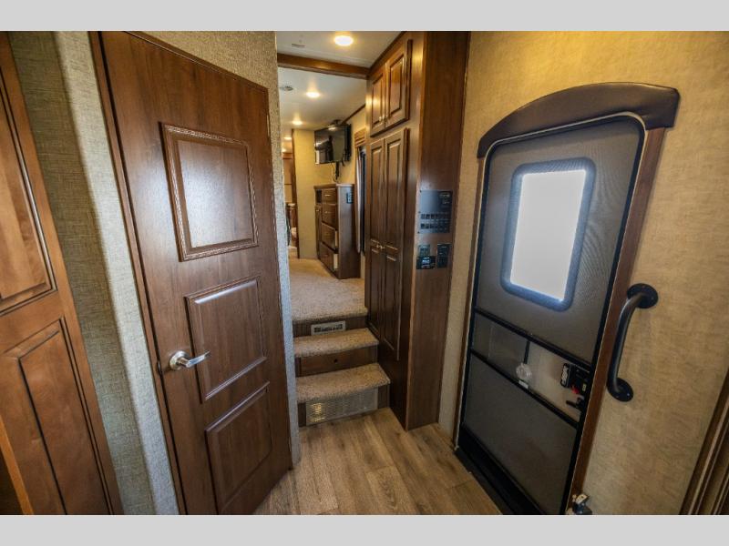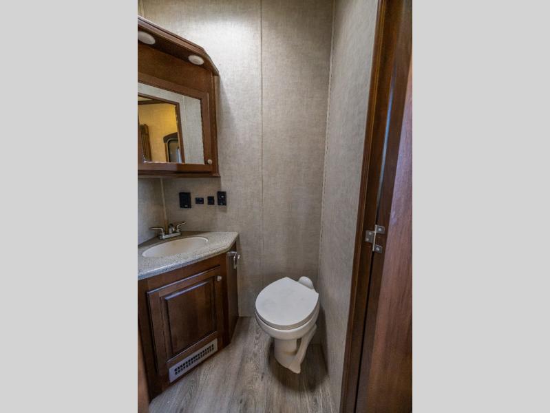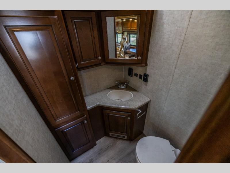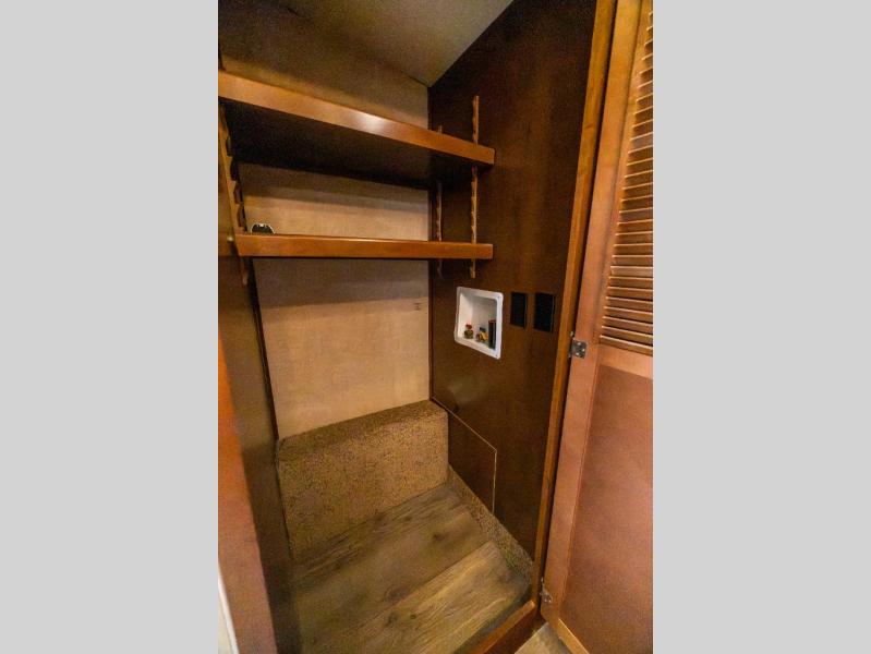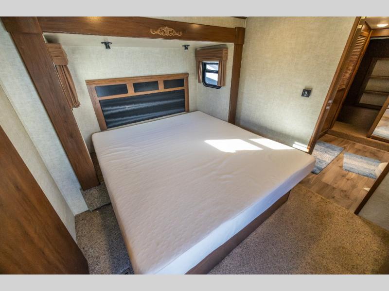 Step up the steps on your right to an upper master suite with full front bath. There is a king bed slide, and storage opposite the bed. The front bath features a shower, toilet, spacious vanity with sink, washer/dryer prepped space that can also be used as a closet, and large front wardrobe with sliding doors.