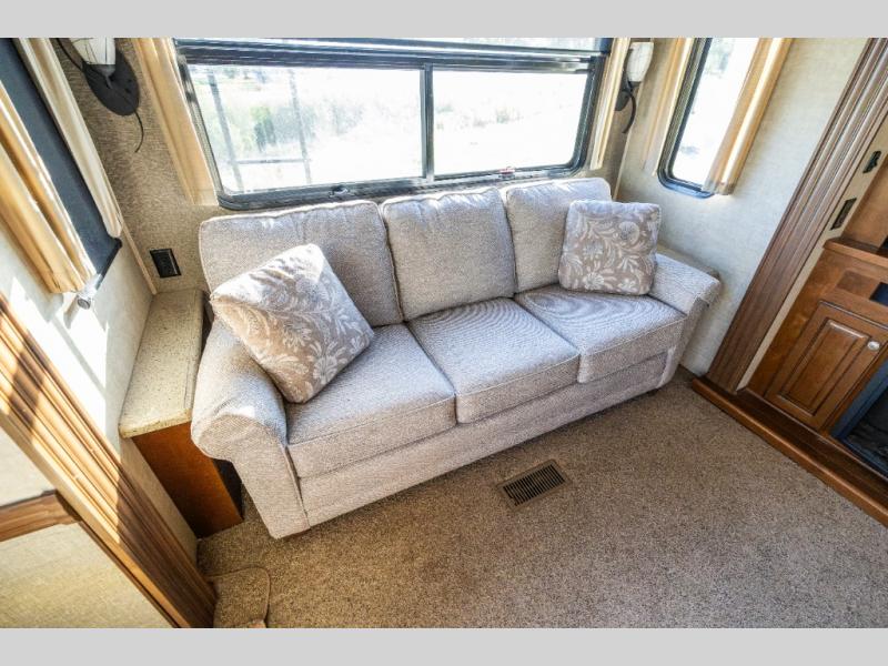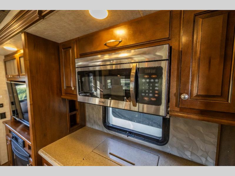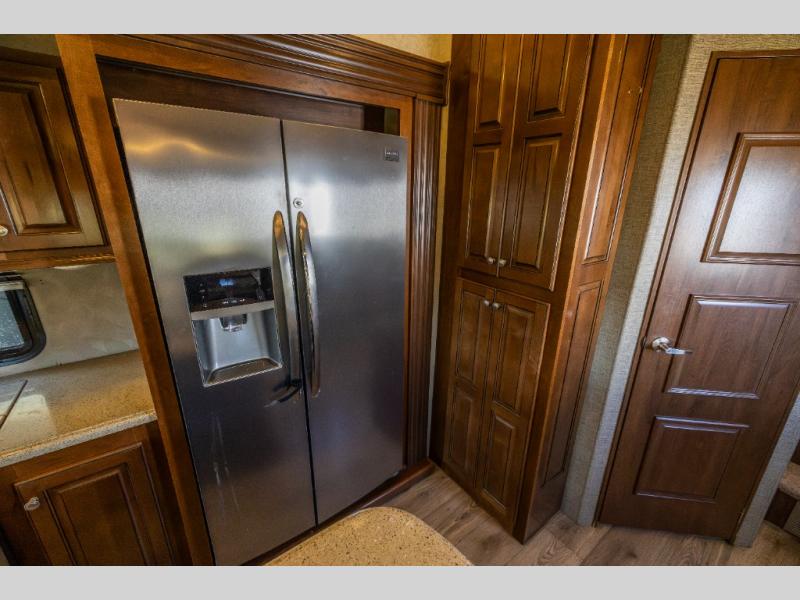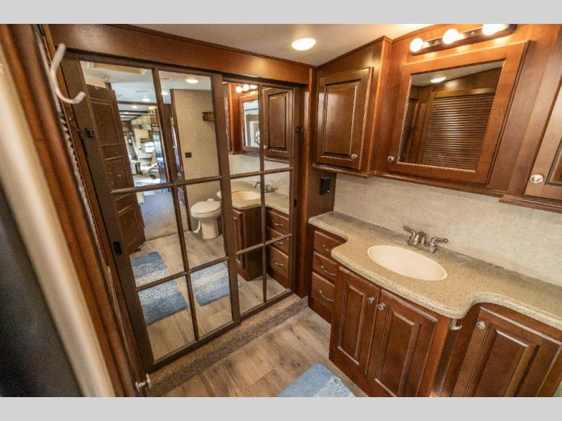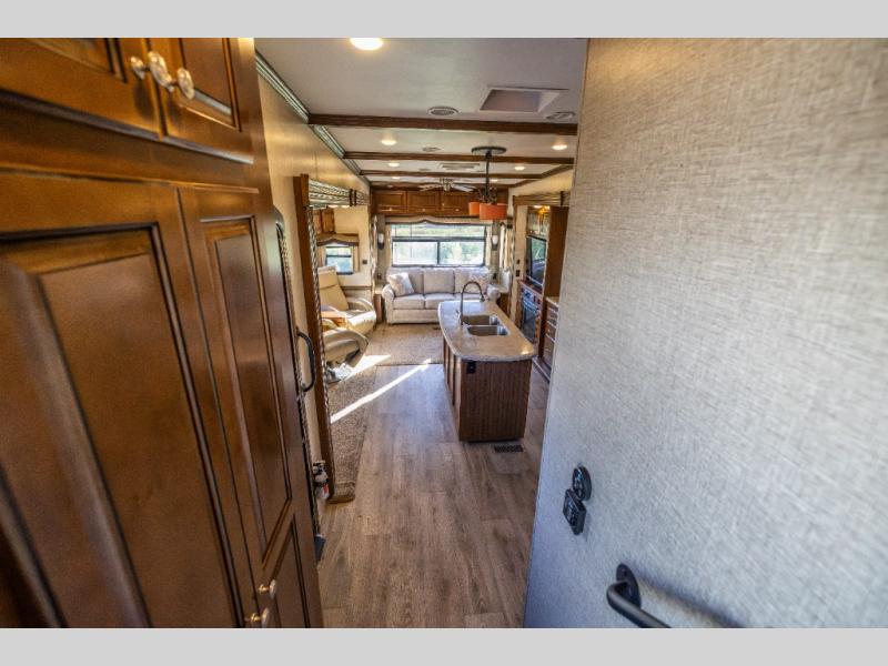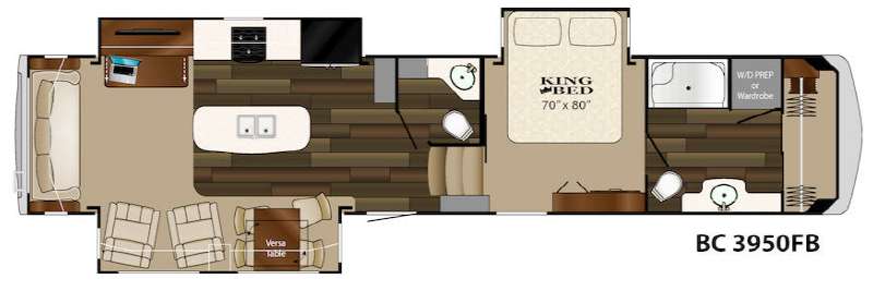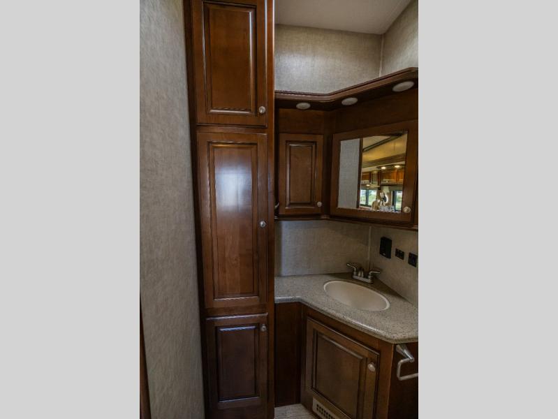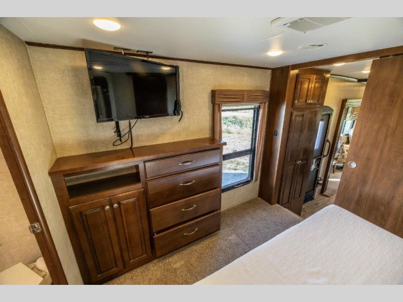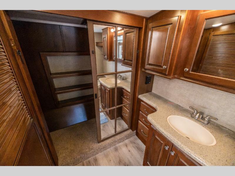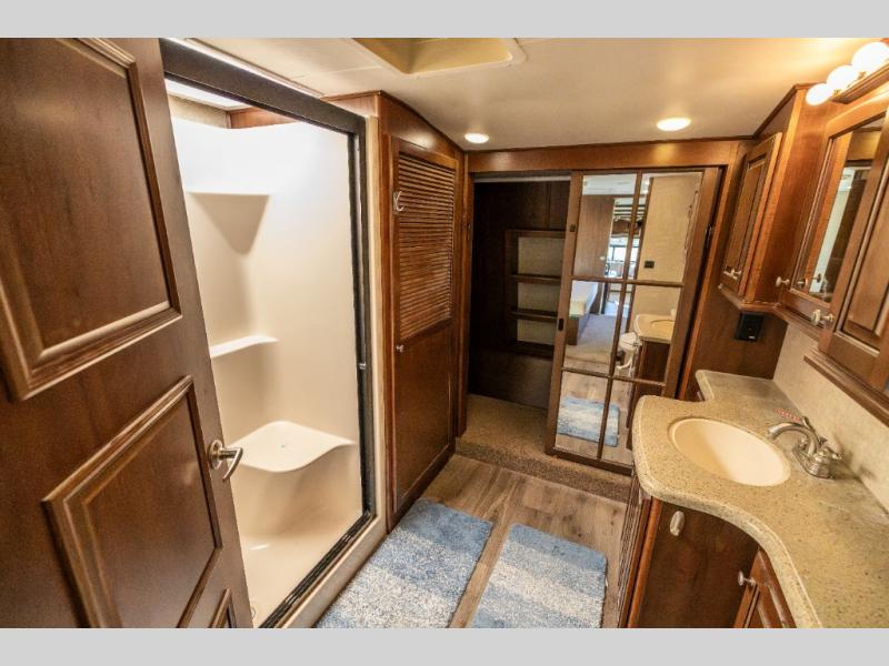Step up the steps on your right to an upper master suite with full front bath. There is a king bed slide, and storage opposite the bed. The front bath features a shower, toilet, spacious vanity with sink, washer/dryer prepped space that can also be used as a closet, and large front wardrobe with sliding doors.
