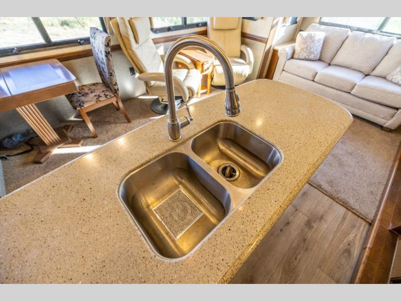 A rear sofa offers more seating, and there is also a kitchen island in the center of the room that provides a bit more counter space, as well as featuring the double sink.