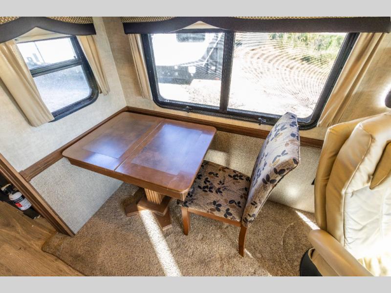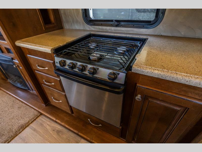Back down to the main combined kitchen and living area you will find a slide out Versa table and four chairs along with two recliners. There is also overhead storage above both. On the opposite side there is a slide out refrigerator, three burner range, overhead cabinet space, and counter area, plus a TV entertainment center with desk below.
