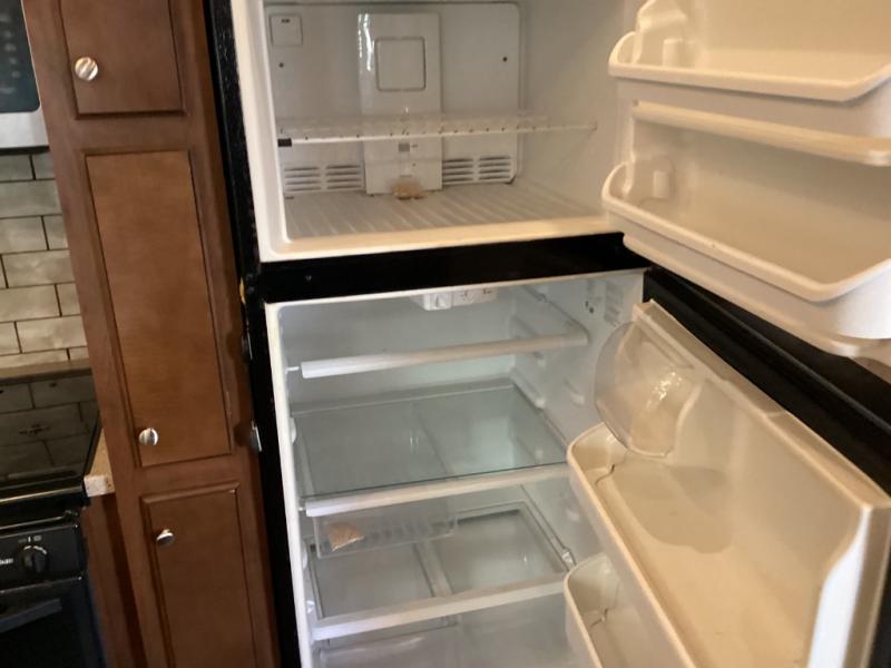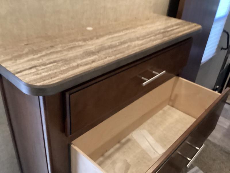 As you enter notice the counter straight ahead with storage above and a double sink. The slide adjacent features two pantries, a refrigerator, and three burner range, plus overhead storage. This slide out also features an entertainment center with flat screen TV.