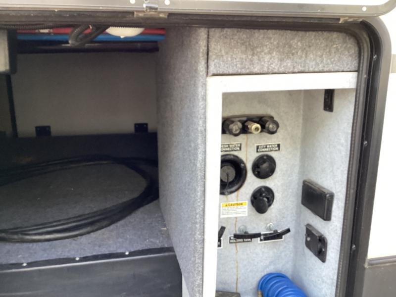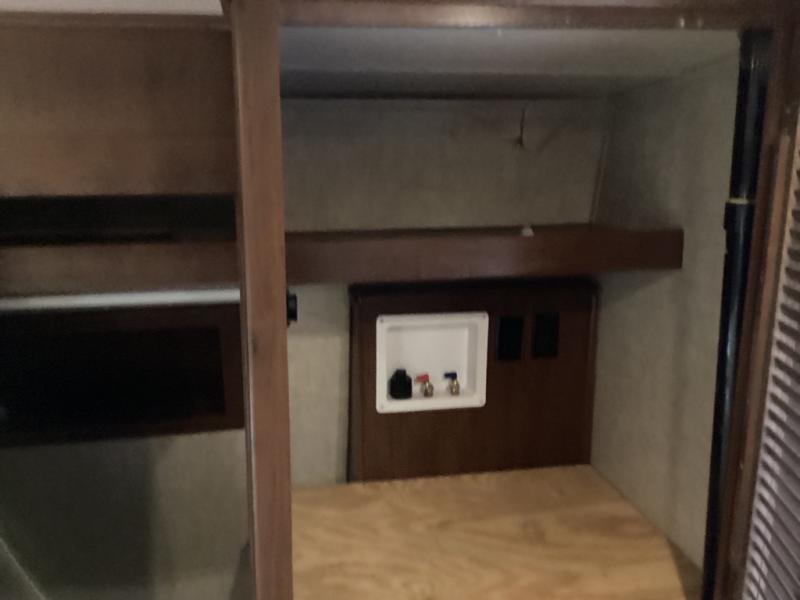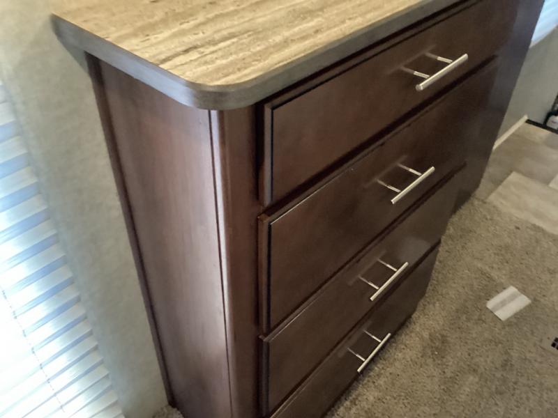 The bedroom features a standard slide king or optional queen size bed. There is a dresser opposite the bed, and a full front wardrobe with a closet that has been prepped for a washer and dryer, and so much more!