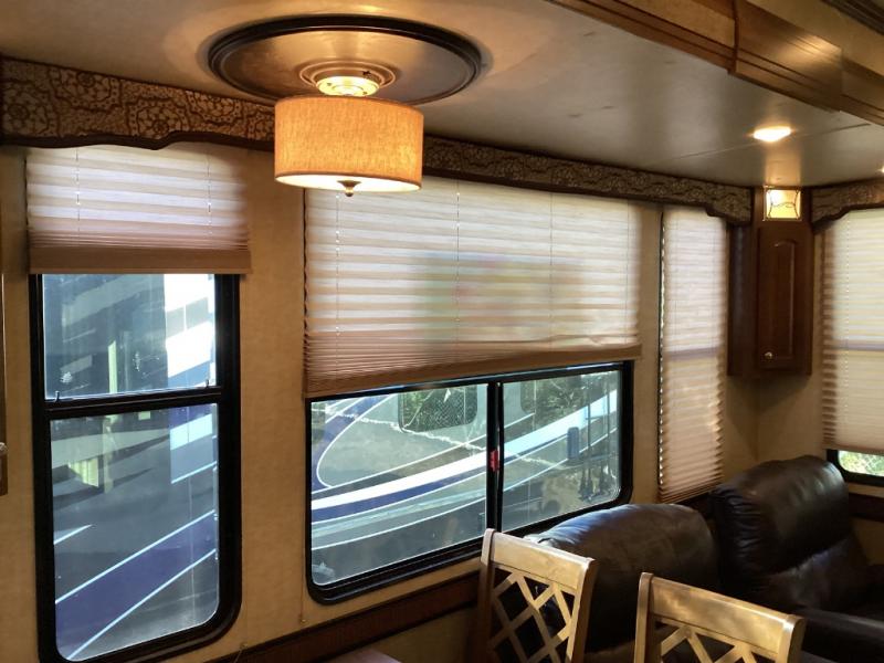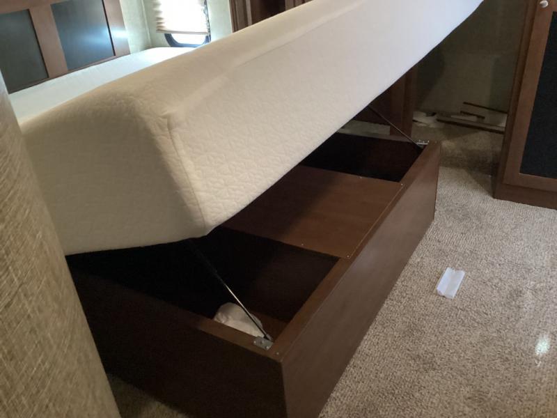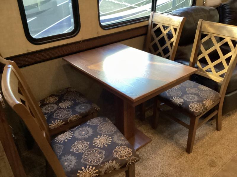 The slide opposite the kitchen area features a dining table to enjoy your meals at, and two lounge chairs with storage above. There is a full sofa across the rear wall with end tables and storage above the entire width of this Oakmont as well.