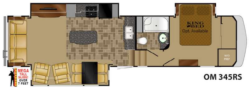 Enjoy camping in this Oakmont fifth wheel by Heartland RV. Inside model 345RS you will find triple slides for increased floor space, and a kitchen island, plus more.
