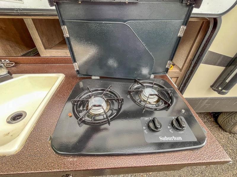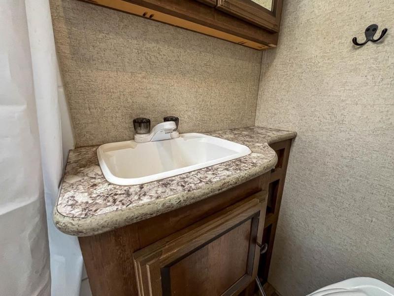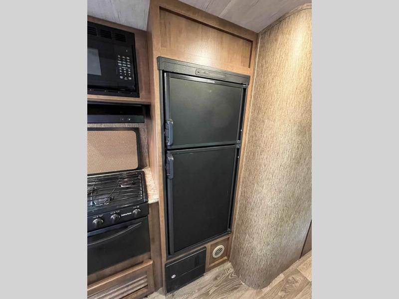 Step inside, and find yourself in the kitchen and living area. The slide opposite of the entry door really helps to open up the floor space. On the slide there is a sofa, overhead cabinet, and booth dinette. At night both the sofa and dinette easily make into additional sleeping space for you. Adjacent to the slide there is storage. To the left of the entry door find a double kitchen sink, three burner range, overhead cabinet, and refrigerator. The entertainment center can be enjoyed by all.
