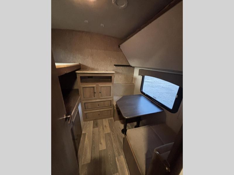 The rear bunk house has a dinette with a bunk above. Opposite find a set of bunk beds.
