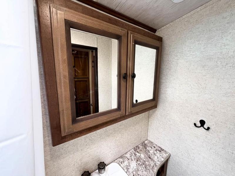 Toward the rear of this model, is the side aisle bathroom with a tub, toilet, sink, and medicine cabinet.