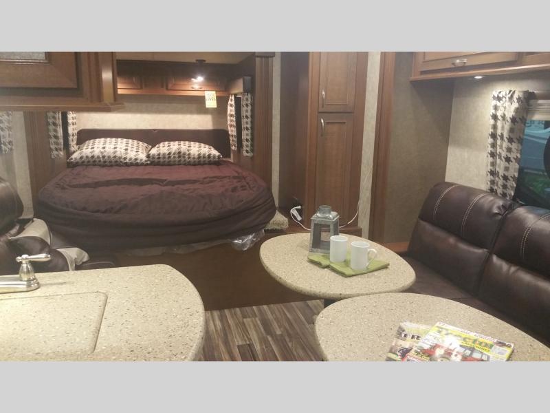 The living room area has a slide also which features a sofa and two pedestal tables. The tables can easily be removed at night, and the sofa makes into additional sleeping space. Adjacent to the sofa there is a space to add an optional TV at the entertainment center. Across from the sofa you will find an additional sofa on the other side of the trailer.