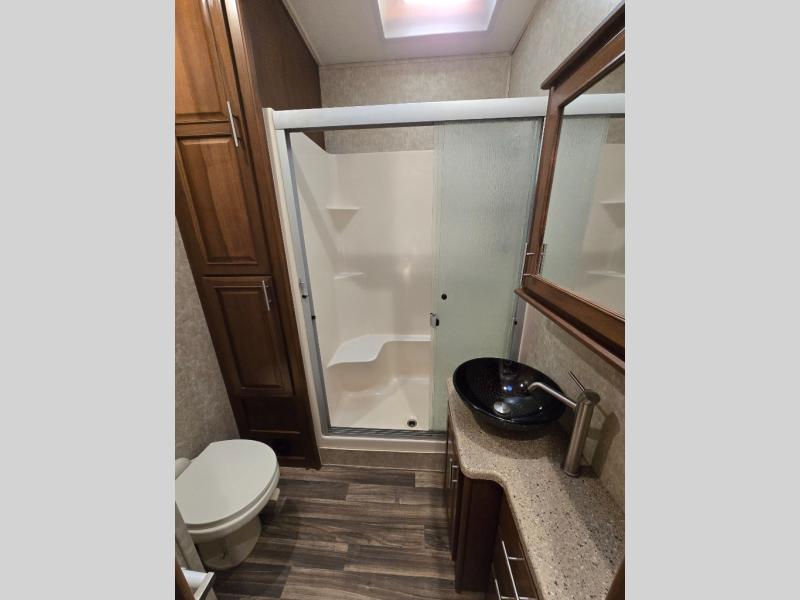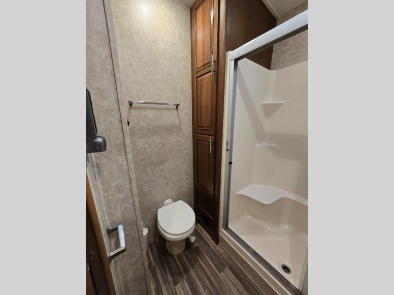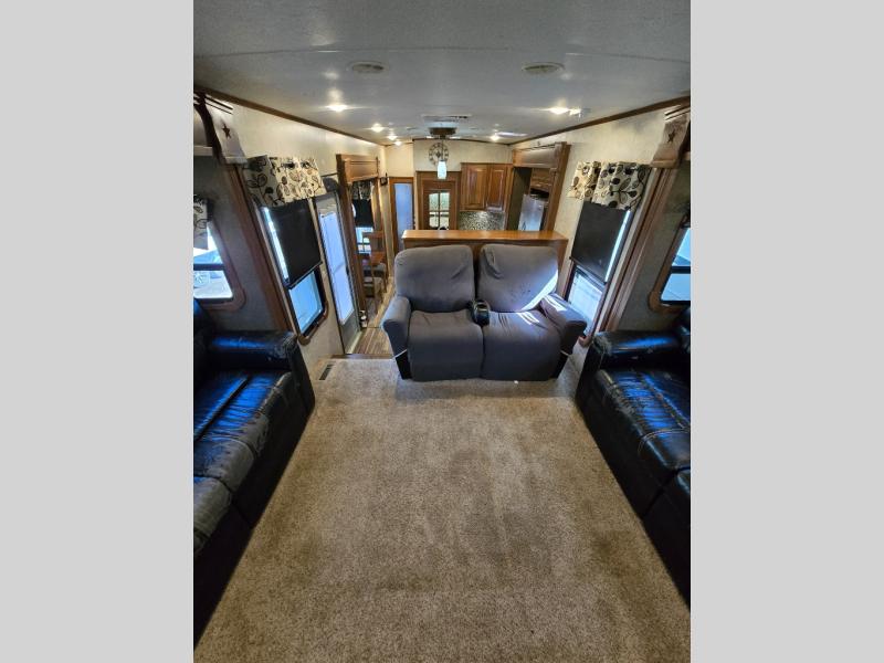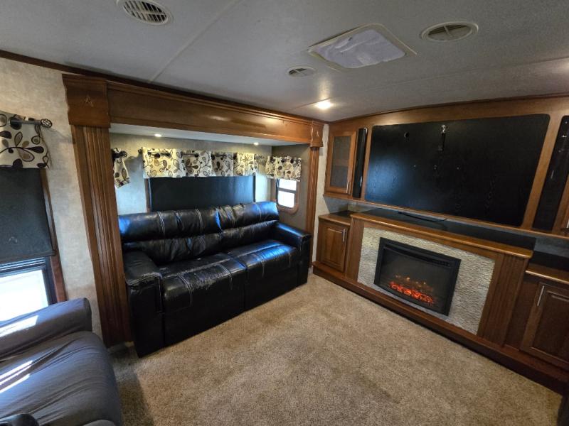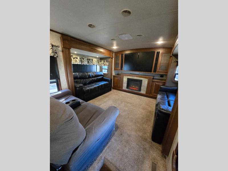 Head up the steps to your right as you enter into the front raised living space that is great for gathering with family and friends. There are dual tri-fold sofas that can easily become extra sleeping space on either end. Along the interior half wall is a theater seat for two with cup holders, and the outer wall features a full wall entertainment center with flat screen TV and fireplace.