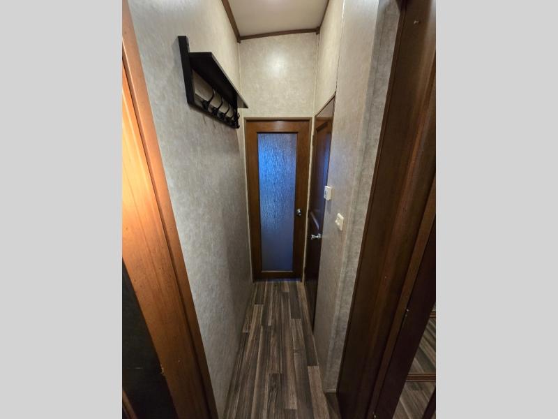 The rear master provides a relaxing retreat with a slide out king bed for sleeping that includes overhead storage. There is a private entry door making access easy from outside, and a rear wall wardrobe with mirrored doors provides ample storage for hanging clothes. There is also a dresser opposite the foot of the bed. Add an optional TV for enjoyment. There is also a prepped space along the outer rear wall for a washer and dryer if you choose to add that convenience as well, plus so much more!