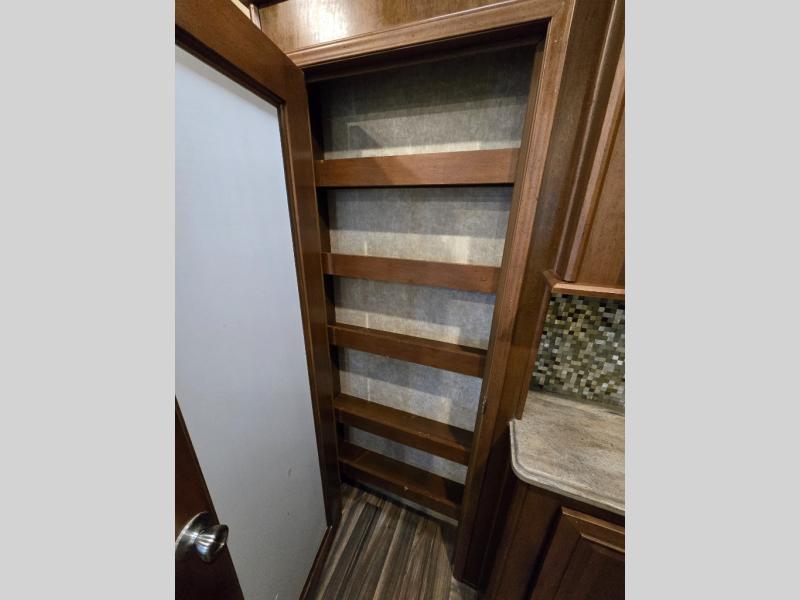 Step inside the door closest to the front and be greeted by an open and spacious kitchen with two of those five slides opposite one another. There is a slide out dining table to the left of the entry door. A convenient island in the center offers added prep space, plus a double sink, and storage. Along both interior walls there is ample storage with a pantry, overhead cabinets, and cupboards for dishes and things. A second slide opposite the door side features a refrigerator, optional 12 cu. ft. or 23 cu. ft. residential, if you choose.