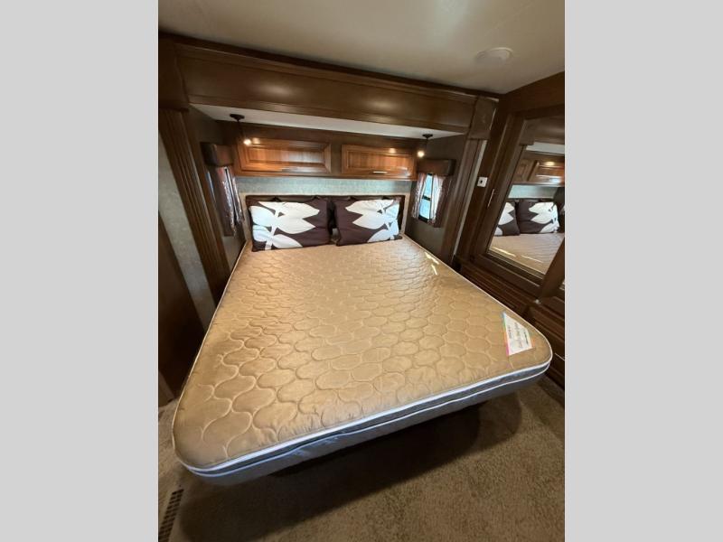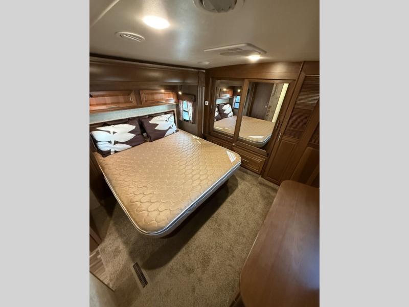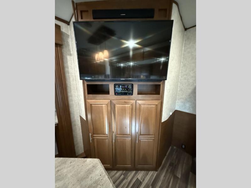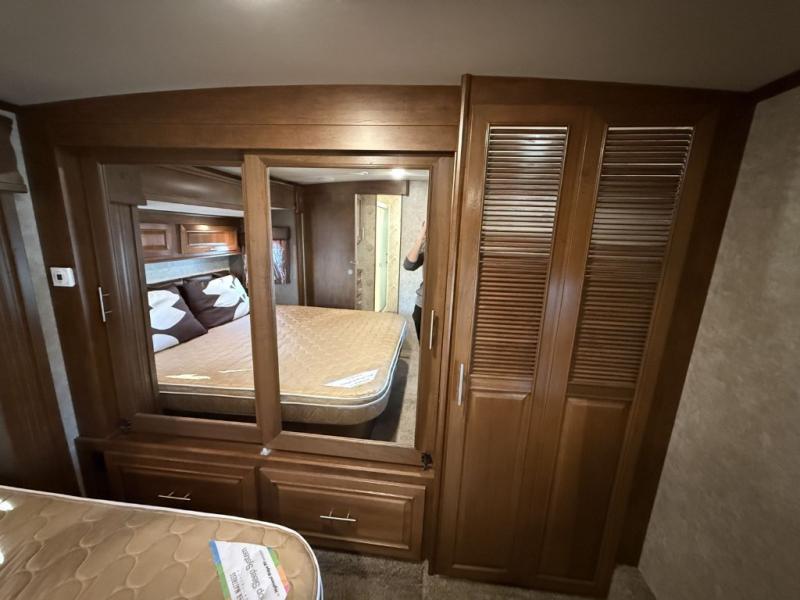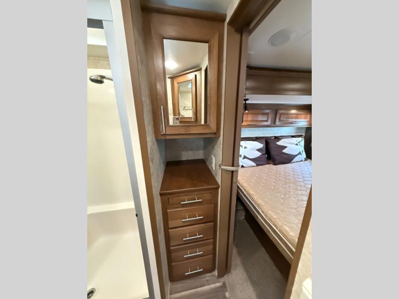The bedroom features a king bed slide out, a full front wardrobe with mirrored door, a washer and dryer prepped closet, and a chest of drawers with an optional TV to add if you would like.