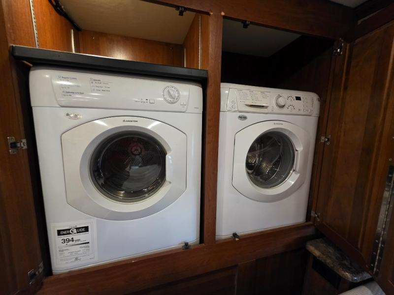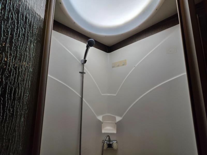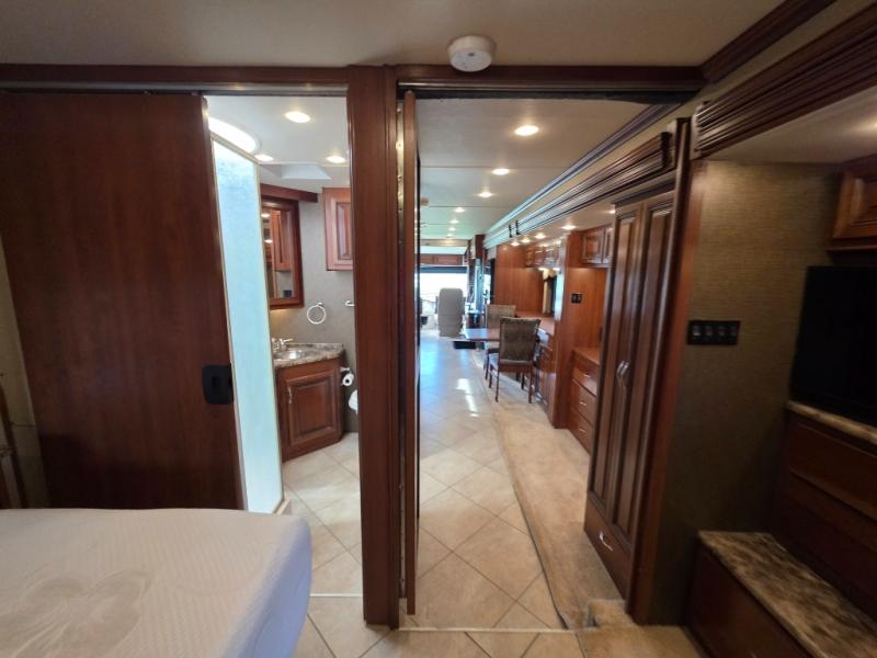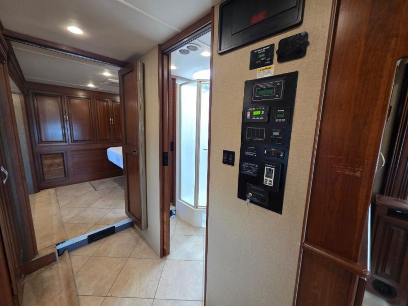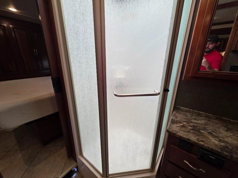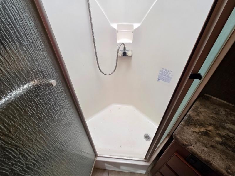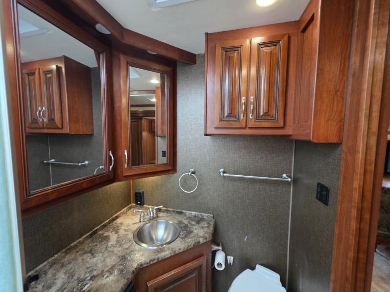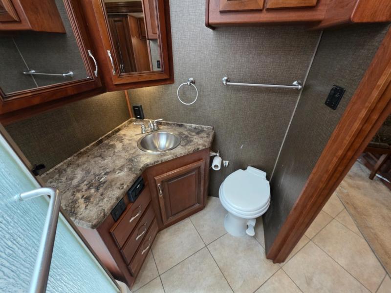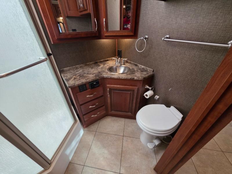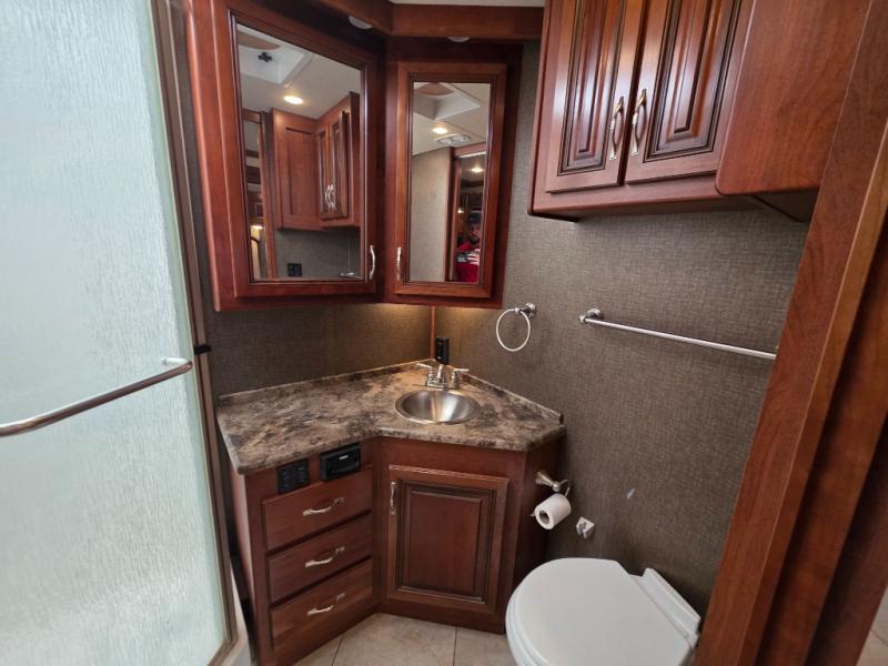 Across from the chest of drawers and first wardrobe in the full slide about mid-coach you will find a complete bath with angled shower, toilet, and corner vanity including a sink. There is also overhead storage. Enjoy the convenience of a second sliding door that leads right into the rear master bedroom.