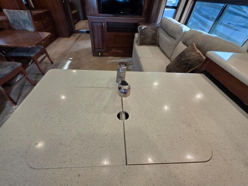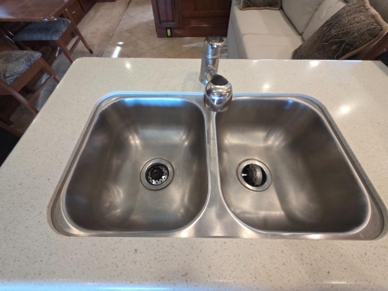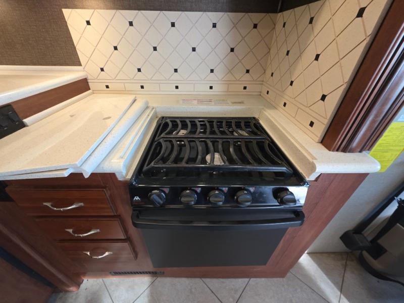 The second slide out in the living/kitchen area is located on the opposite wall. There is a sofa, a L-shaped countertop with a double kitchen sink, and a three burner range with overhead microwave. There is also a pedestal table in between the driver and passenger's chair for additional tabletop space.