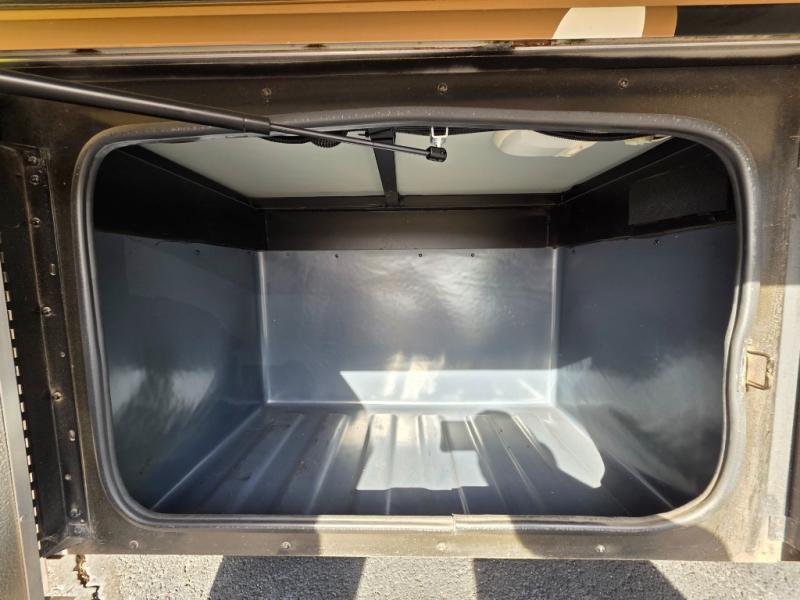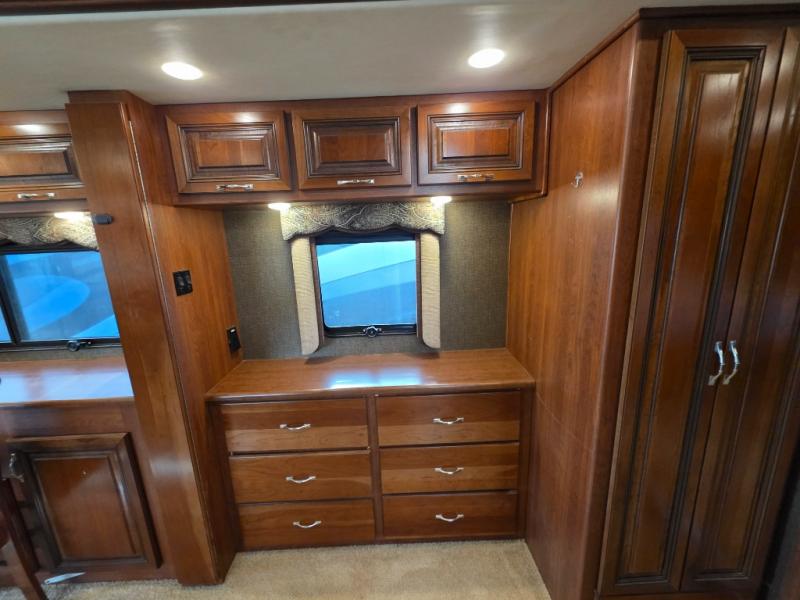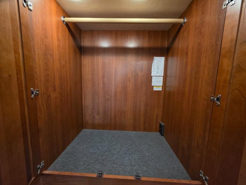 The master is quite spacious also with plenty of storage including three wardrobes across the back of the coach, over bed storage, plus the slide out dresser / wardrobe in the full wall slide that ends here in the master bedroom. There is a queen bed slide including a nightstand on both sides that really opens up the space providing plenty of foot traffic room. If you need additional sleeping space you may choose to add an over the cab drop down queen bed, or sofa bed with air mattress.