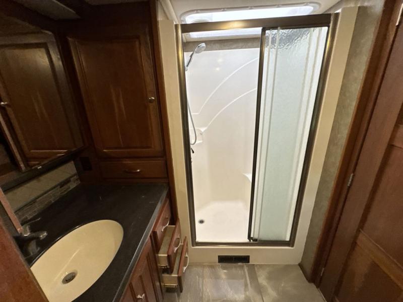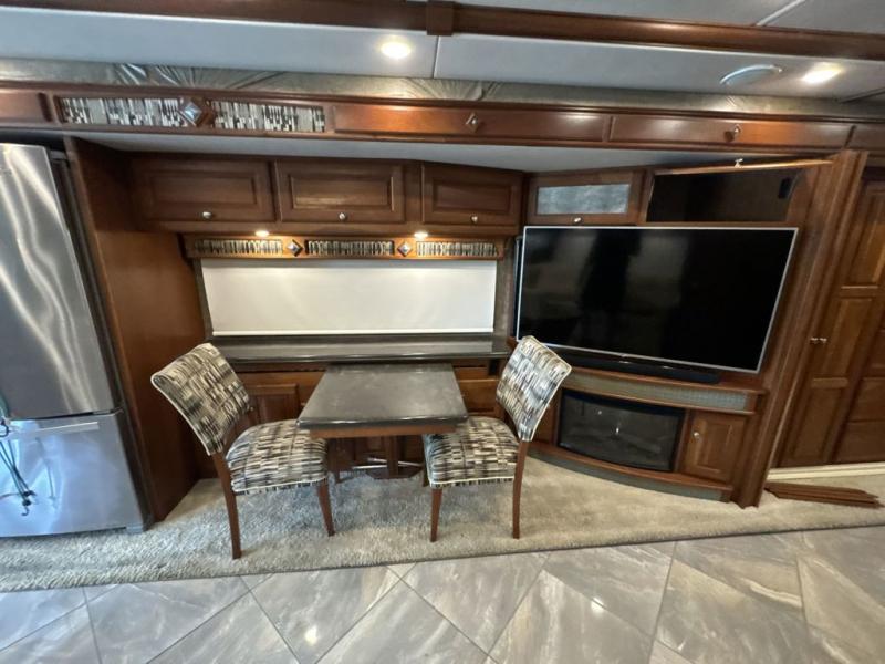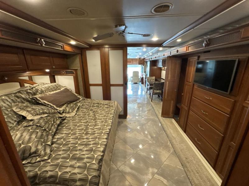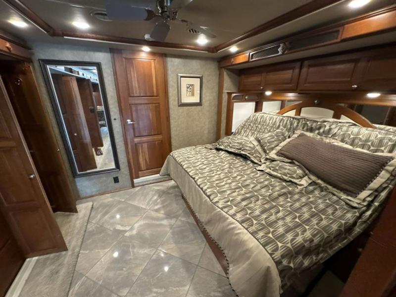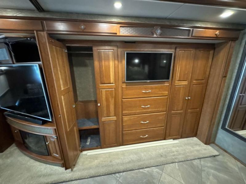 Opposite and featured in the center of the full wall slide is a 55" HDTV and a fireplace that can easily be viewed by everyone in the room. The slide continues with the bedroom wardrobes and chest of drawers opposite the queen bed slide with nightstands. There is also a 32" HDTV for your enjoyment. The bedroom is tucked between the living area and the rear master bath beyond double sliding doors.