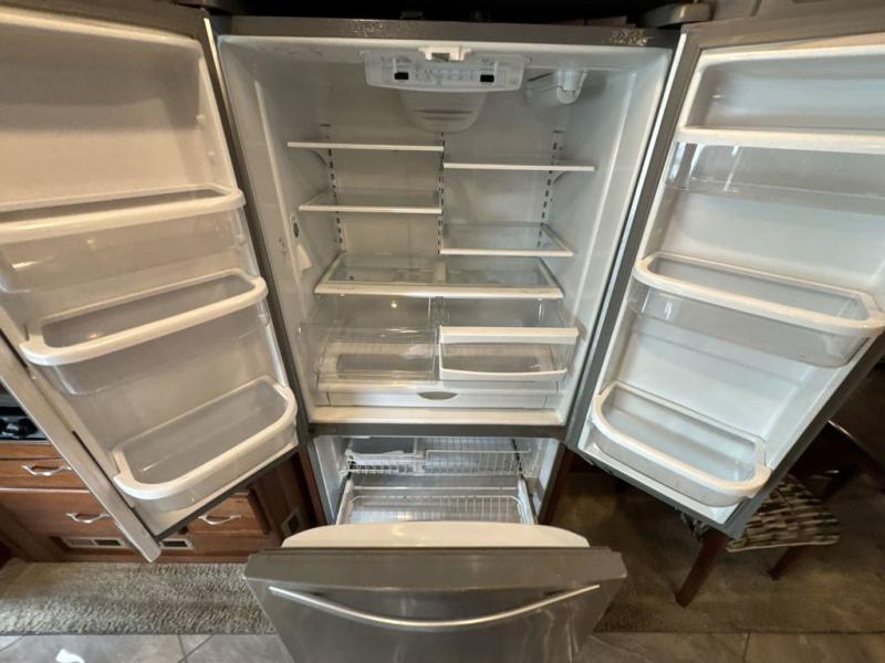 As you enter notice the kitchen area up front. There is a slide out three burner range and residential refrigerator, along with a Glide and Dine table and chairs behind the passenger seat. On the opposite side find a large counter area with overhead storage and a double kitchen sink in the slide out behind the driver's seat. There is also a Rest Easy extendable sectional sofa in the slide out that is 60" x 75".