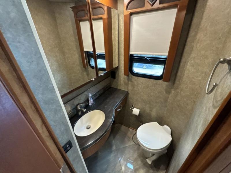 A half bath with toilet and large vanity with sink including overhead storage is conveniently located in the center of the coach. It is opposite the TV and fireplace.