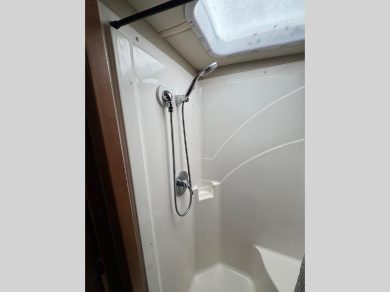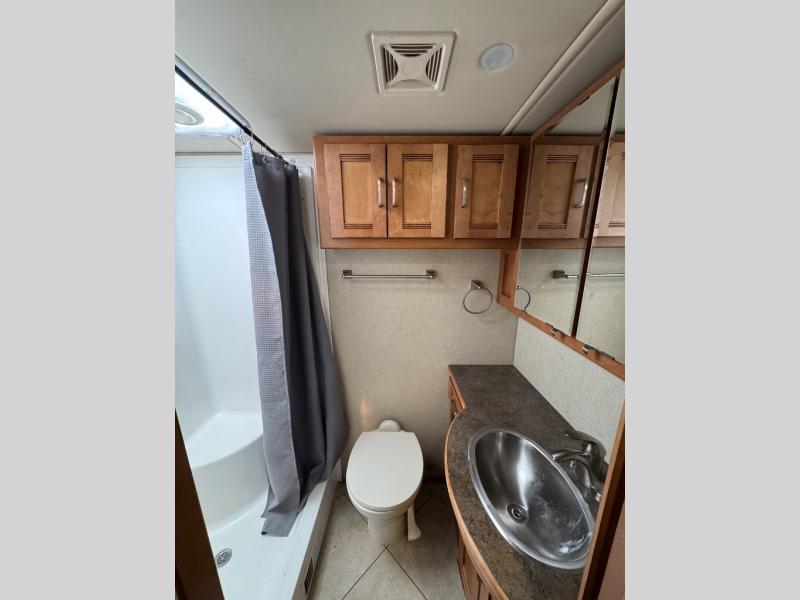 The complete bath is also centrally located and provides a shower, toilet, and vanity with sink, plus overhead storage.