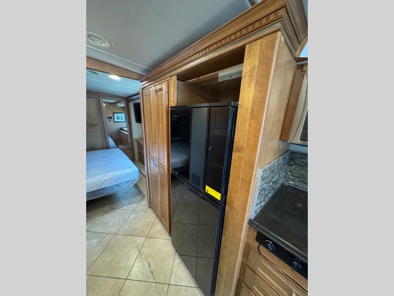 Heading further back you will come to the kitchen and bath area. The kitchen begins at the head of the driver's side slide out with an angled double sink, a three burner range, a residential refrigerator, and storage cabinet that is also the location of the washer and dryer if you wish to add that convenience. Here you will have no problem creating meals and snacks while on the move.