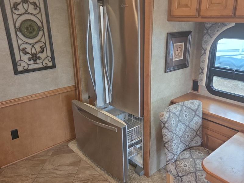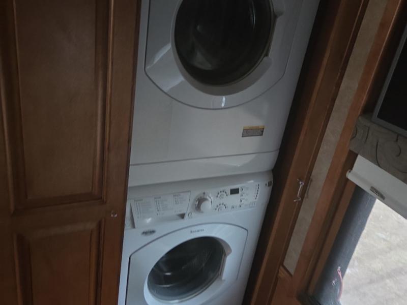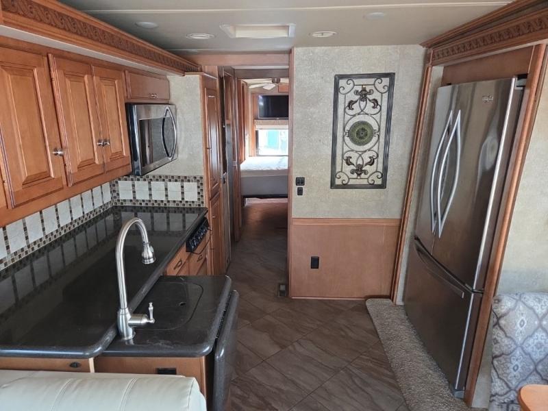 The full wall slide starting behind the driver's seat features a rest easy sofa, double kitchen sink, three burner range, 4 door refrigerator, storage cabinet that is also the location of the optional washer and dryer, plus the slide continues to the rear ending with a chest of drawers and a bedroom HDTV location.