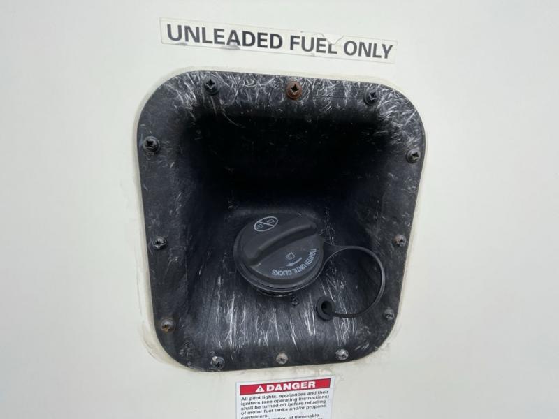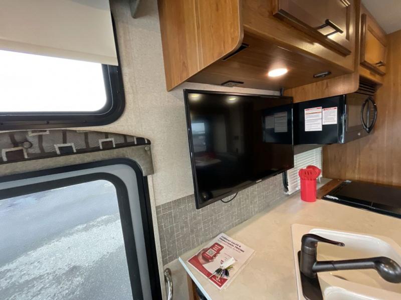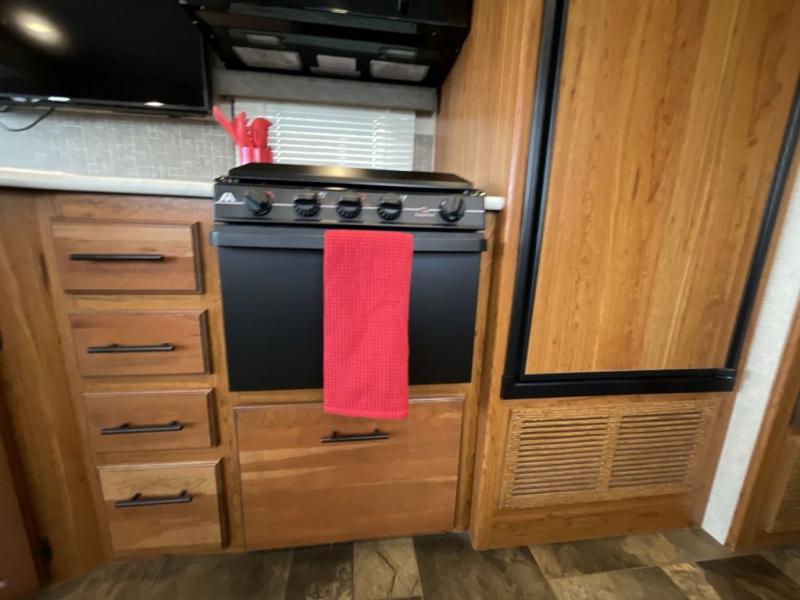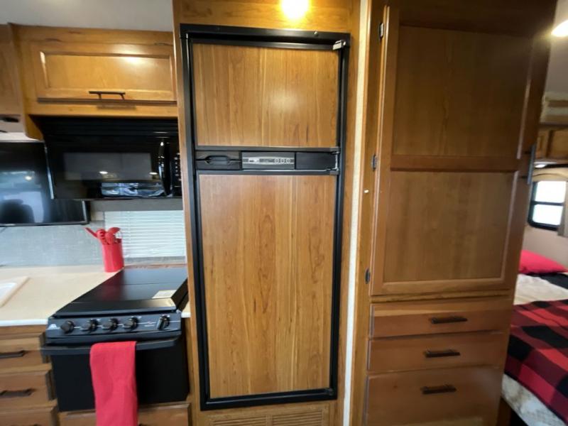 Step inside the motor home and see how spacious and open the living and kitchen areas are with the slide that is located behind the driver's seat. The slide has a sofa with an overhead cabinet and a dinette. Above the cab area you can choose to an optional drop down bunk. Behind the passengers seat, the kitchen area has an angled double kitchen sink, overhead 39" TV, microwave, three burner range, and refrigerator.