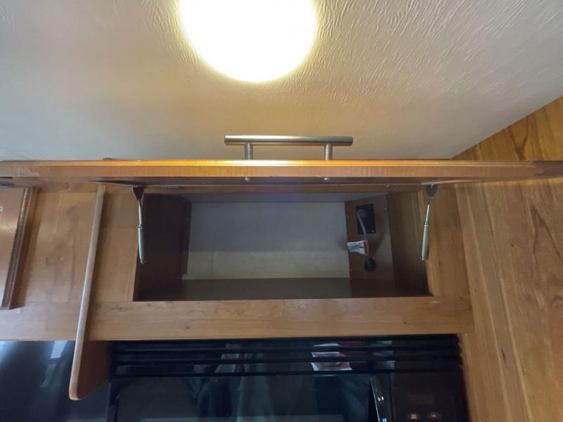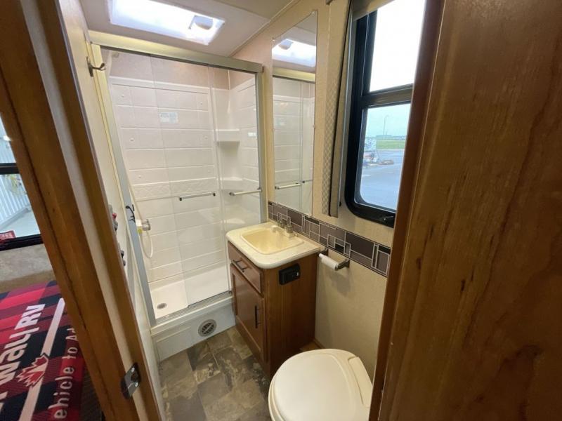 Also in the rear of the motor home is the bathroom. The bathroom has a toilet, sink, and shower. Outside of the bathroom there is a linen cabinet where you can easily store towels or toiletries.