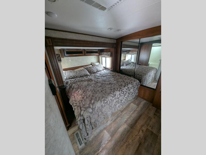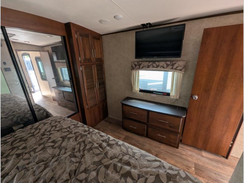 The front bedroom offers a comfortable King bed slide, a large wardrobe, storage, washer and dryer prepped closet, and a dresser with an overhead TV, and a 2nd 15,000 BTU air conditioner!