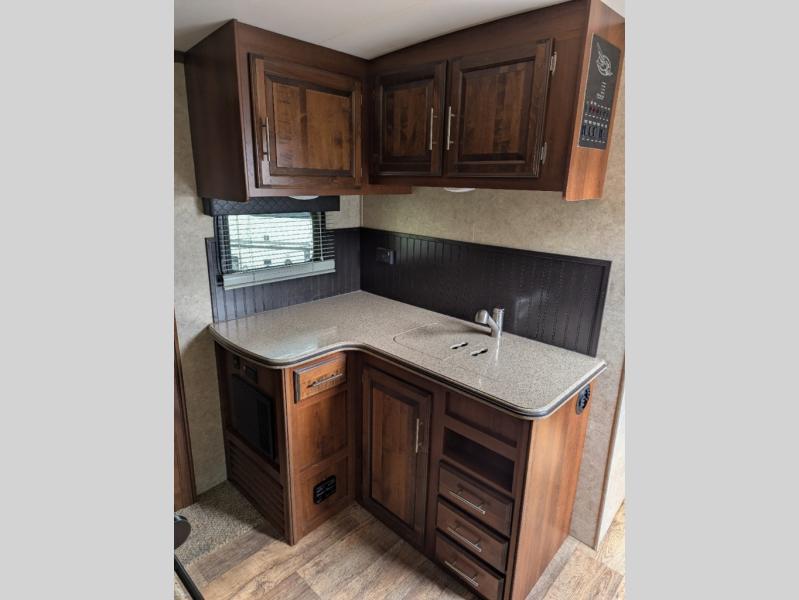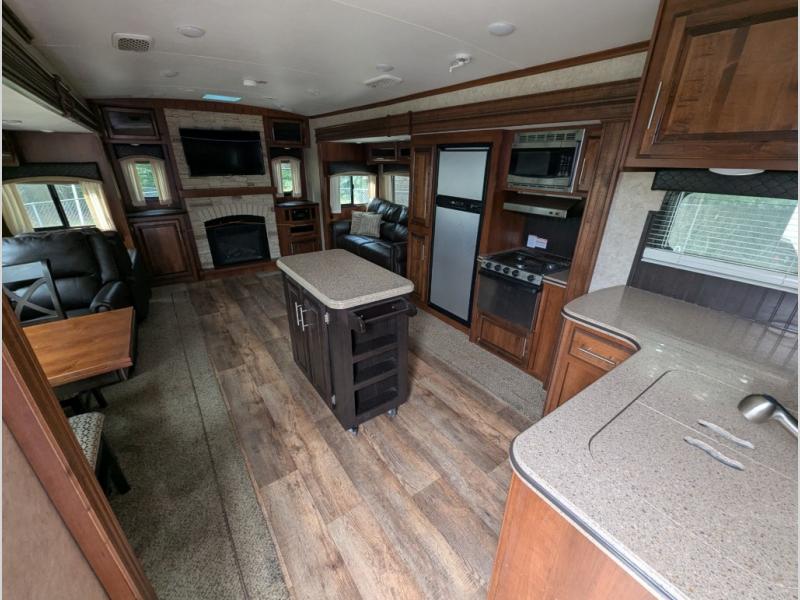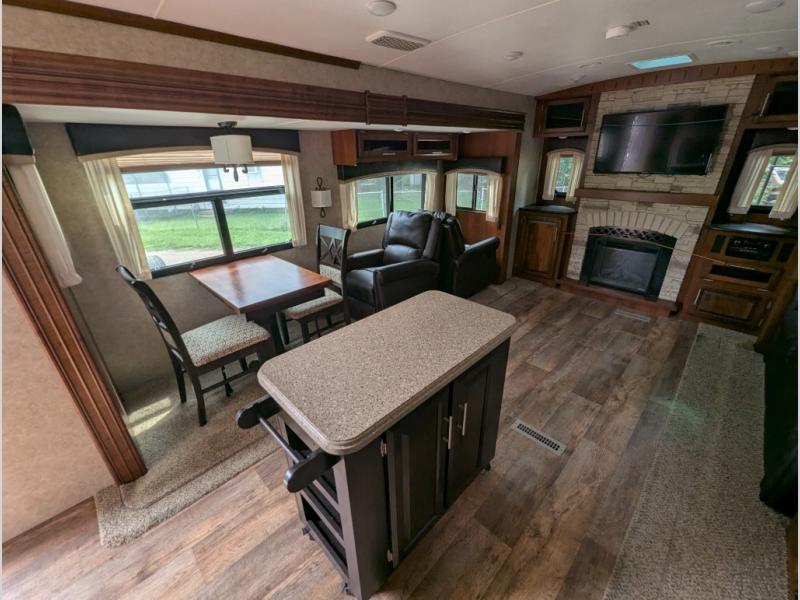 Along the rear wall is an entertainment center with a fireplace. There is an additional slide with a hide-a-bed sofa, pantry, refrigerator, microwave, and three burner range on the road side. Along the interior wall in the kitchen area you will find a spacious counter, a portable island providing extra counter space, overhead cabinets, and a double kitchen sink.