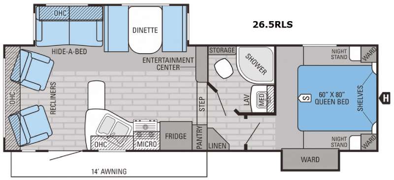 When you enter the 26.5RLS you will be in the rear of the fifth wheel. There are two recliners in the rear, a slide with a hide-a-bed and dinette slide on the road side, and an entertainment center on the interior wall.