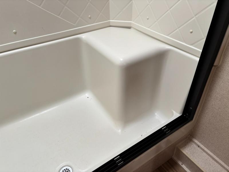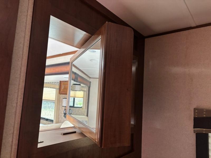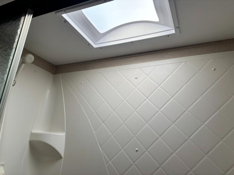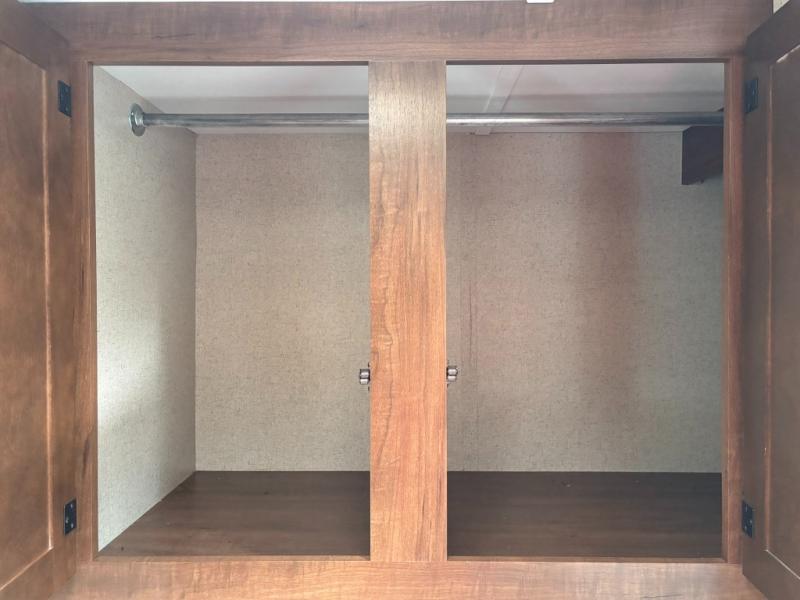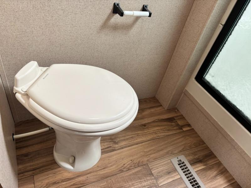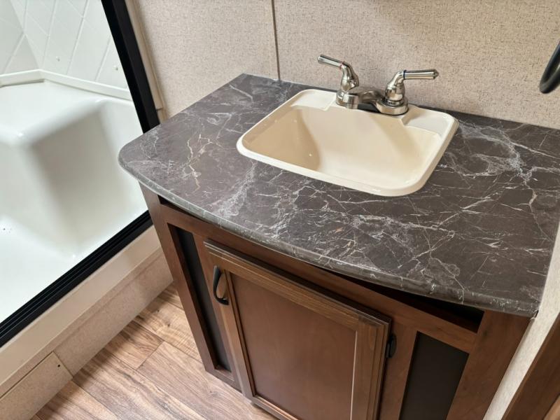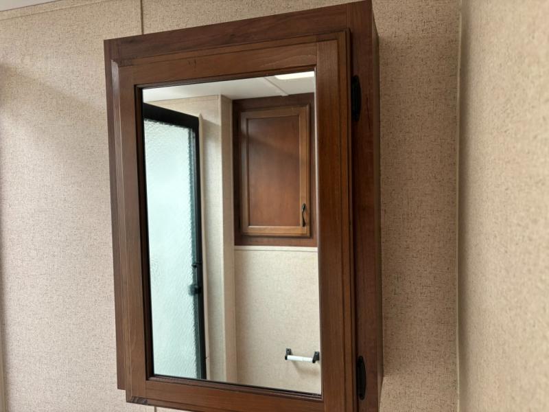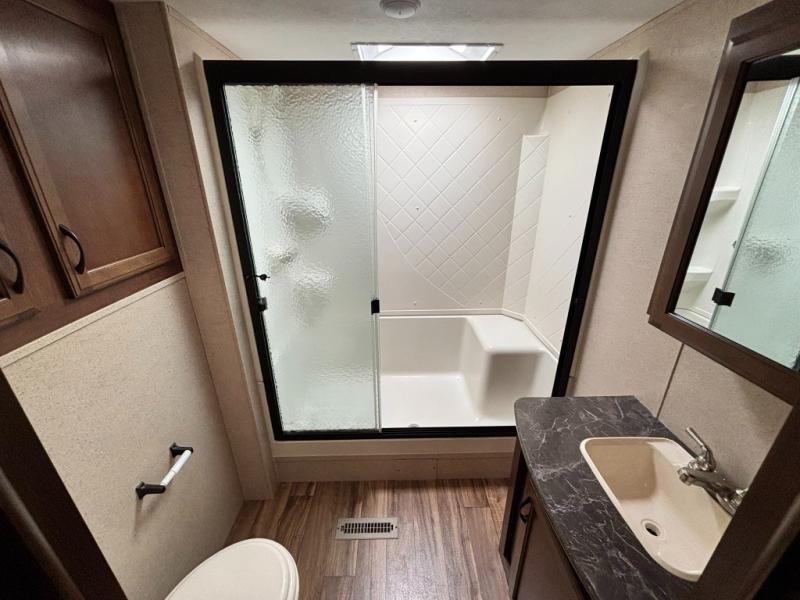 The large bathroom is located in the rear of the trailer. Inside the bathroom you will find a sink, medicine cabinet, shower and toilet.