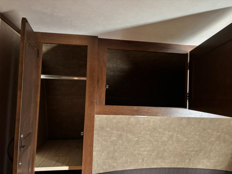 In the front bedroom you will find a queen bed with wardrobes on either side of the bed, and an overhead cabinet above the bed.