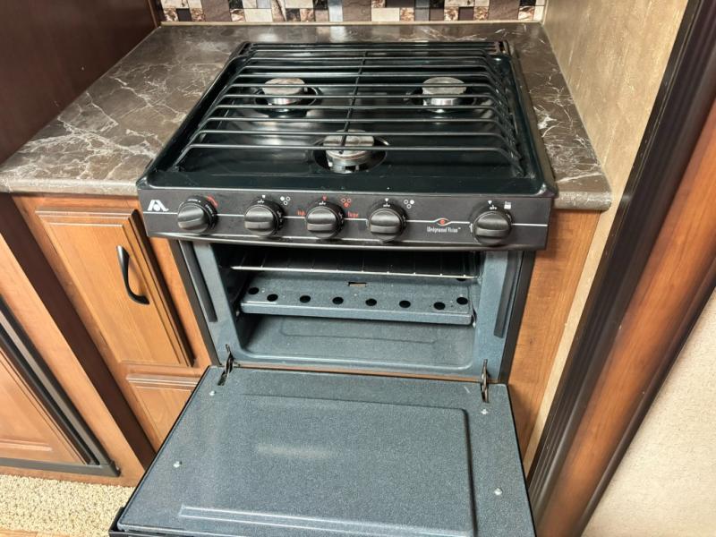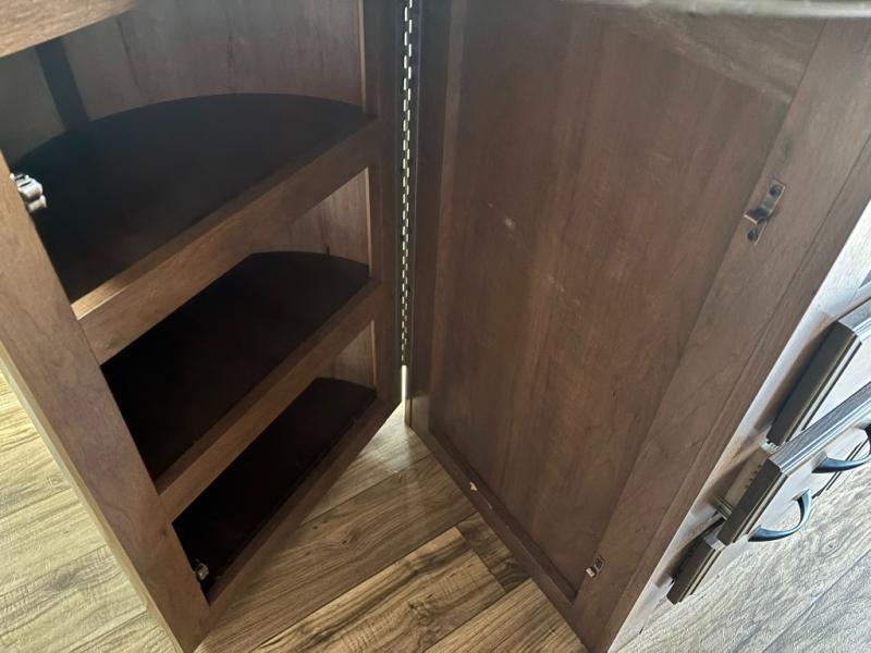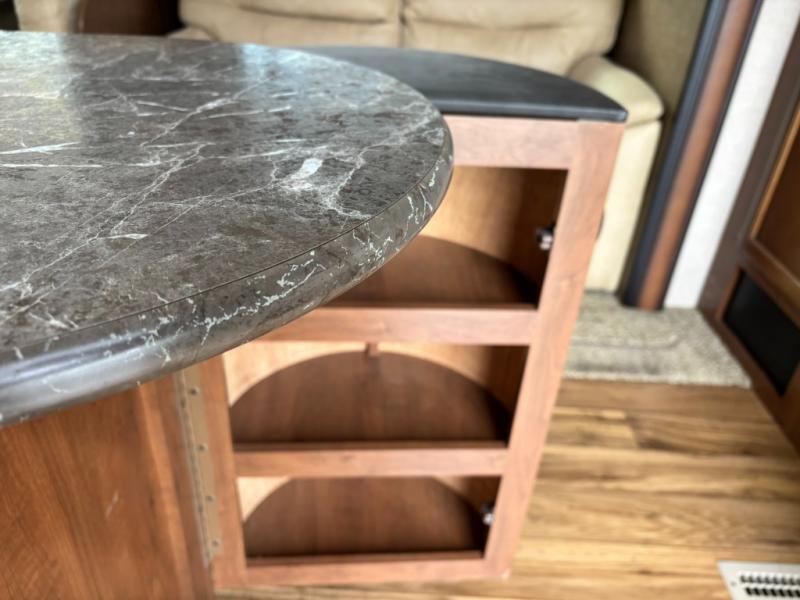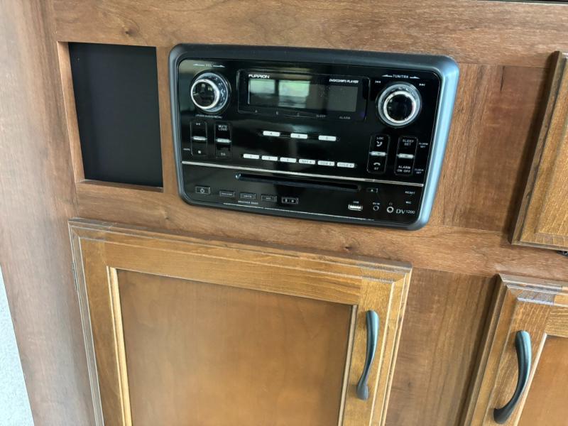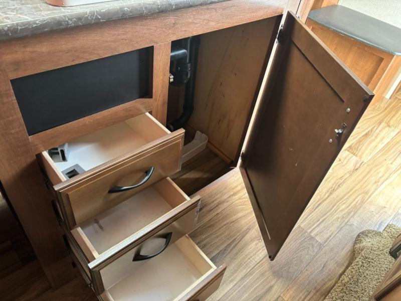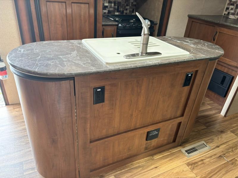 In the kitchen and main living area there are two slides. One slide has a refrigerator, three burner range, and microwave. Next to the slide there is a large pantry for your food items. The other slide has a dinette or optional free-standing table and chairs and a sofa or an optional hide-a-bed. The entertainment center can easily be viewed while working in the kitchen. The kitchen island has extra counter space for food prep and also a double kitchen sink.