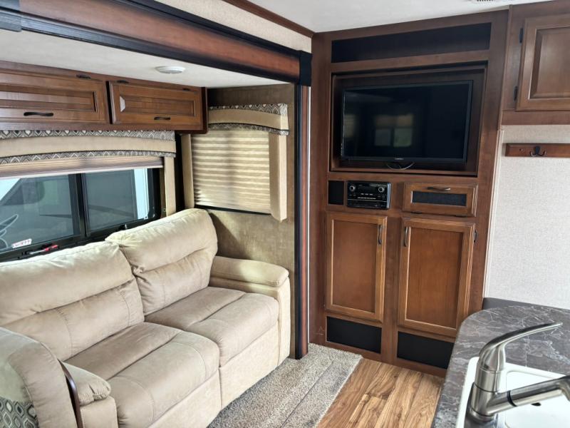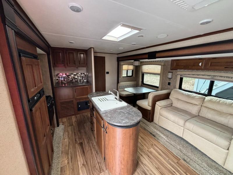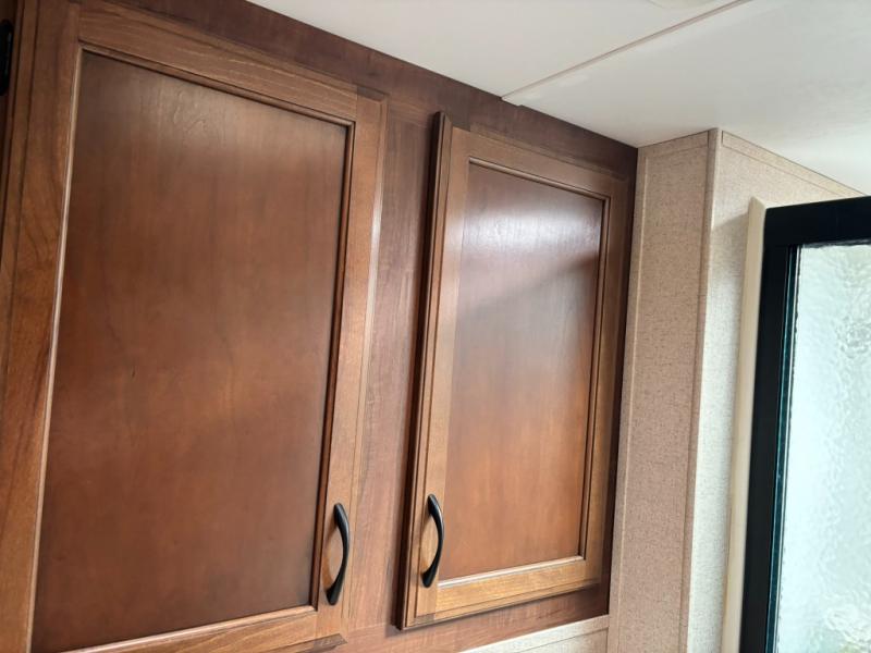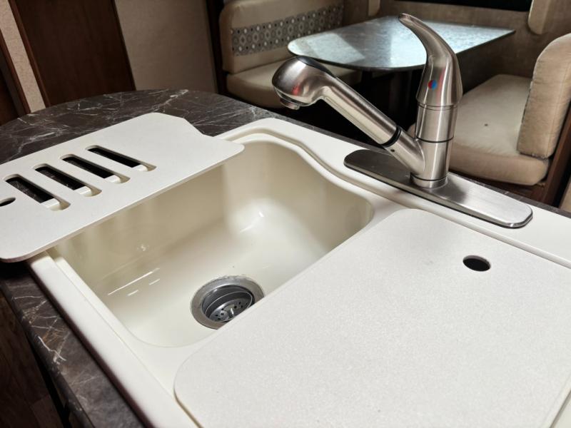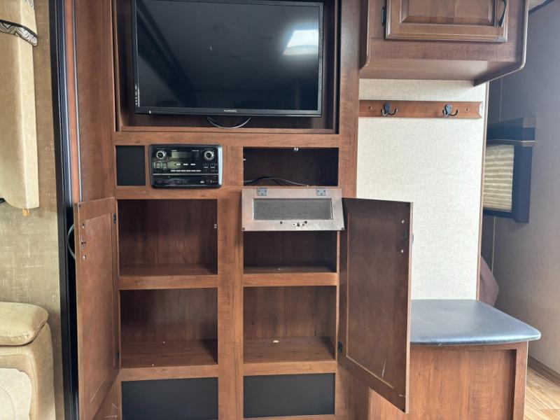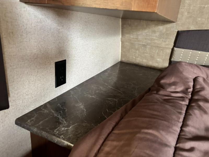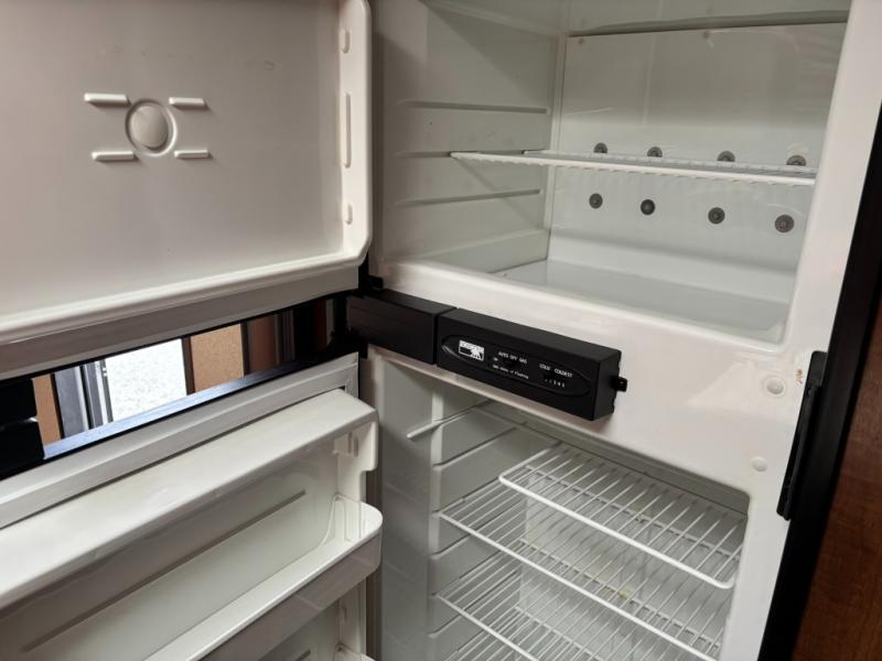 In the kitchen and main living area there are two slides. One slide has a refrigerator, three burner range, and microwave. Next to the slide there is a large pantry for your food items. The other slide has a dinette or optional free-standing table and chairs and a sofa or an optional hide-a-bed. The entertainment center can easily be viewed while working in the kitchen. The kitchen island has extra counter space for food prep and also a double kitchen sink.