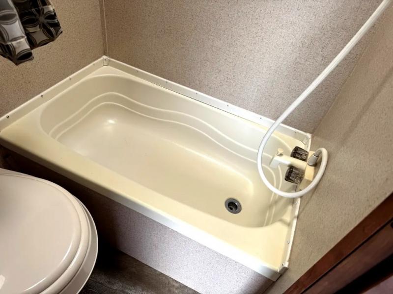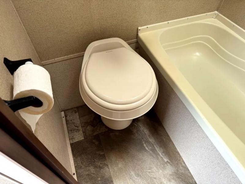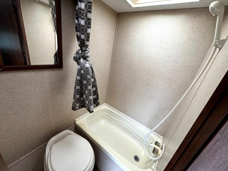 As you enter the travel trailer, along the left side there is a nice size wardrobe. The bathroom is also in the rear of this model. Inside the bathroom you will find a toilet, and tub/shower.