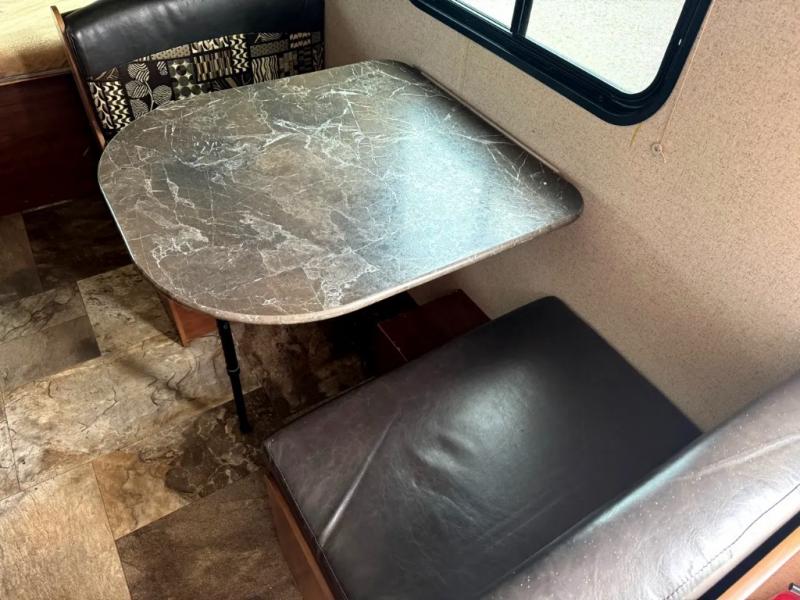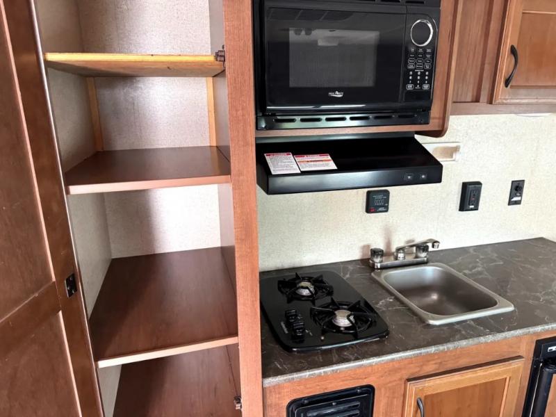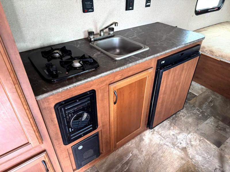 You can easily fix meals and snacks while away from home with the two burner range and microwave. Clean up is easy with the kitchen sink. There is also a refrigerator, extra counter space, and a large pantry. On the opposite side of the trailer enjoy meals at the dinette. You can convert the dinette into extra sleeping space if needed.