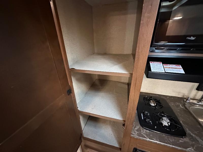 One side of the travel trailer has a pantry, two burner range, microwave, overhead cabinet, and sink. The other side offers a dinette with an overhead cabinet above.