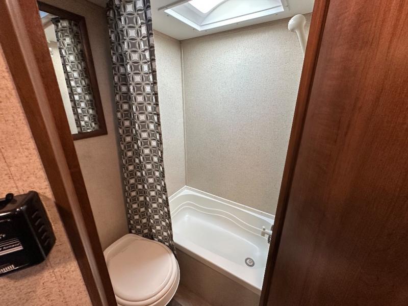 As you enter the travel trailer, to the left is a wardrobe. Continuing in the rear you will find the bathroom with a toilet, tub/shower.