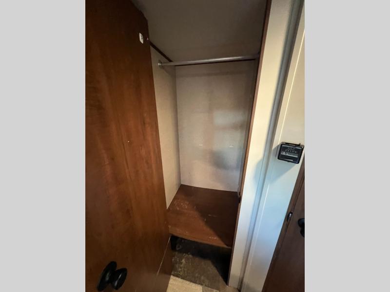 As you enter the travel trailer, to the left is a wardrobe. Continuing in the rear you will find the bathroom with a toilet, tub/shower.