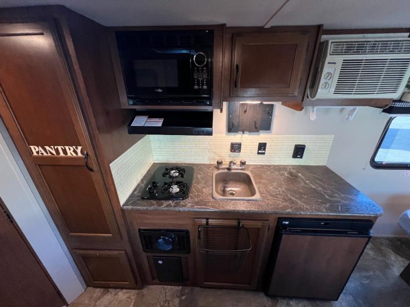 One side of the travel trailer has a pantry, two burner range, microwave, overhead cabinet, and sink. The other side offers a dinette with an overhead cabinet above.