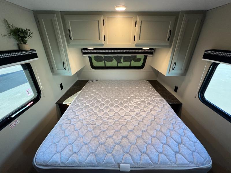 In the very front of the travel trailer there is a queen bed with wardrobes on either side of the bed, and an overhead cabinet to help keep your things tidy.