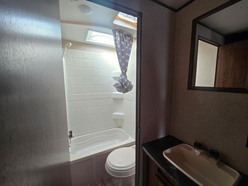 The bathroom is located in the right rear corner of the trailer. In the bathroom there is a tub/shower and toilet. Just outside of the bathroom area there is a sink.
