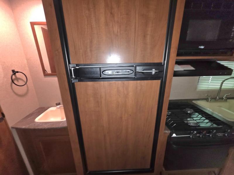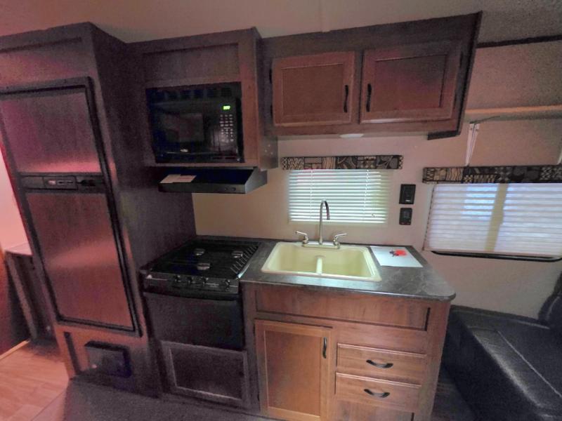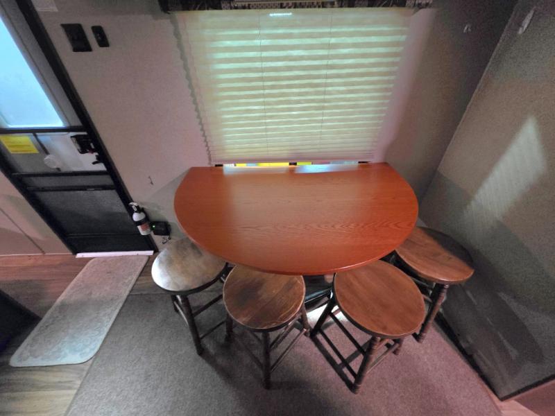 As you enter the travel trailer, to the left there is a custom dinette with 4 stools. Across from the dinette you will see a refrigerator, three burner range, microwave, and double kitchen sink. There is also a nice sofa in the main living area.