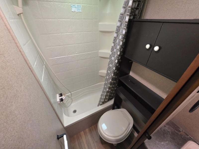 The bathroom is located in the right rear corner of the trailer. In the bathroom there is a tub/shower and toilet. Just outside of the bathroom area there is a sink.