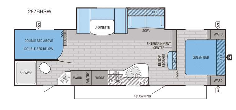 As you enter the travel trailer, to the left you will find an angled double kitchen sink, three burner range, refrigerator, pantry, and wardrobe. The opposite side of the trailer has a slide with a u-dinette and sofa. Next to the slide you will find an entertainment center and a bench/storage.