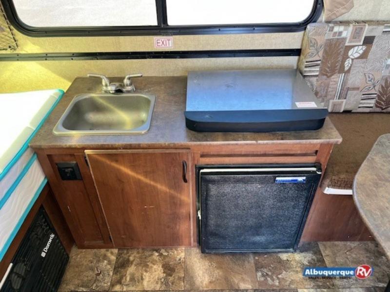 As you enter the camper, to the left there is a cabinet. Along the front of the trailer you will find a dinette. One side of the trailer offers a three burner range and a sink. In the rear you will find a full bed.